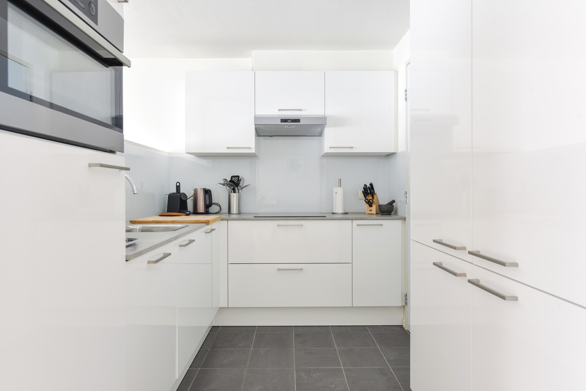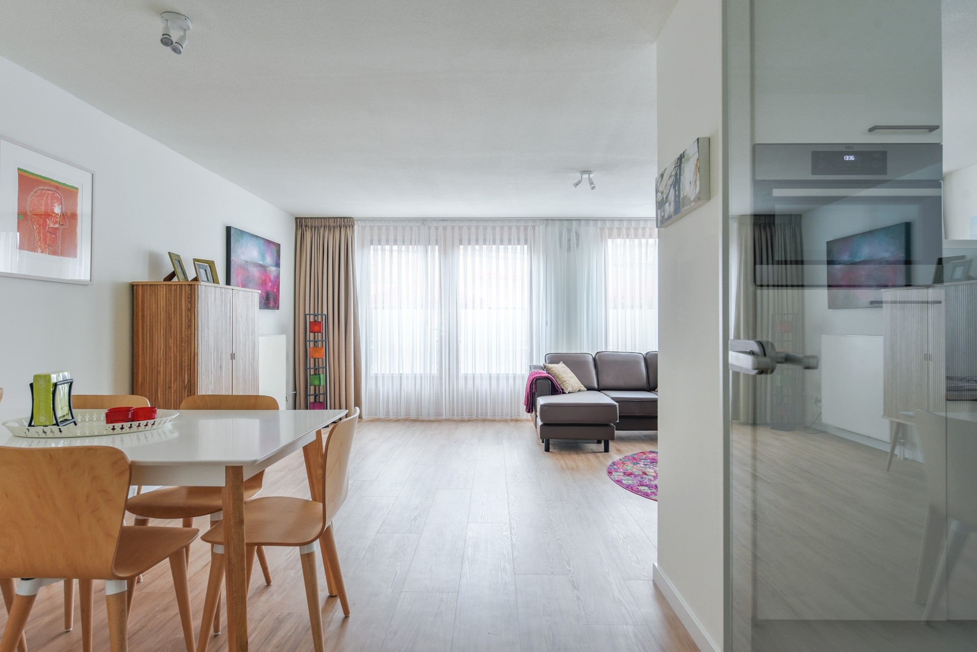 The spacious living room has laminate flooring with French doors with 2 French balconies with the view of the Jan van Lieshoutstraat / Heuvel Galerie at the front. The new open kitchen is equipped with all built-in appliances such as an induction hob, extractor hood, combi microwave, dishwasher and fridge with freezer compartment. The central heating is located in a separate storage room / utility room. installation, mechanical installation and a washer and dryer.
