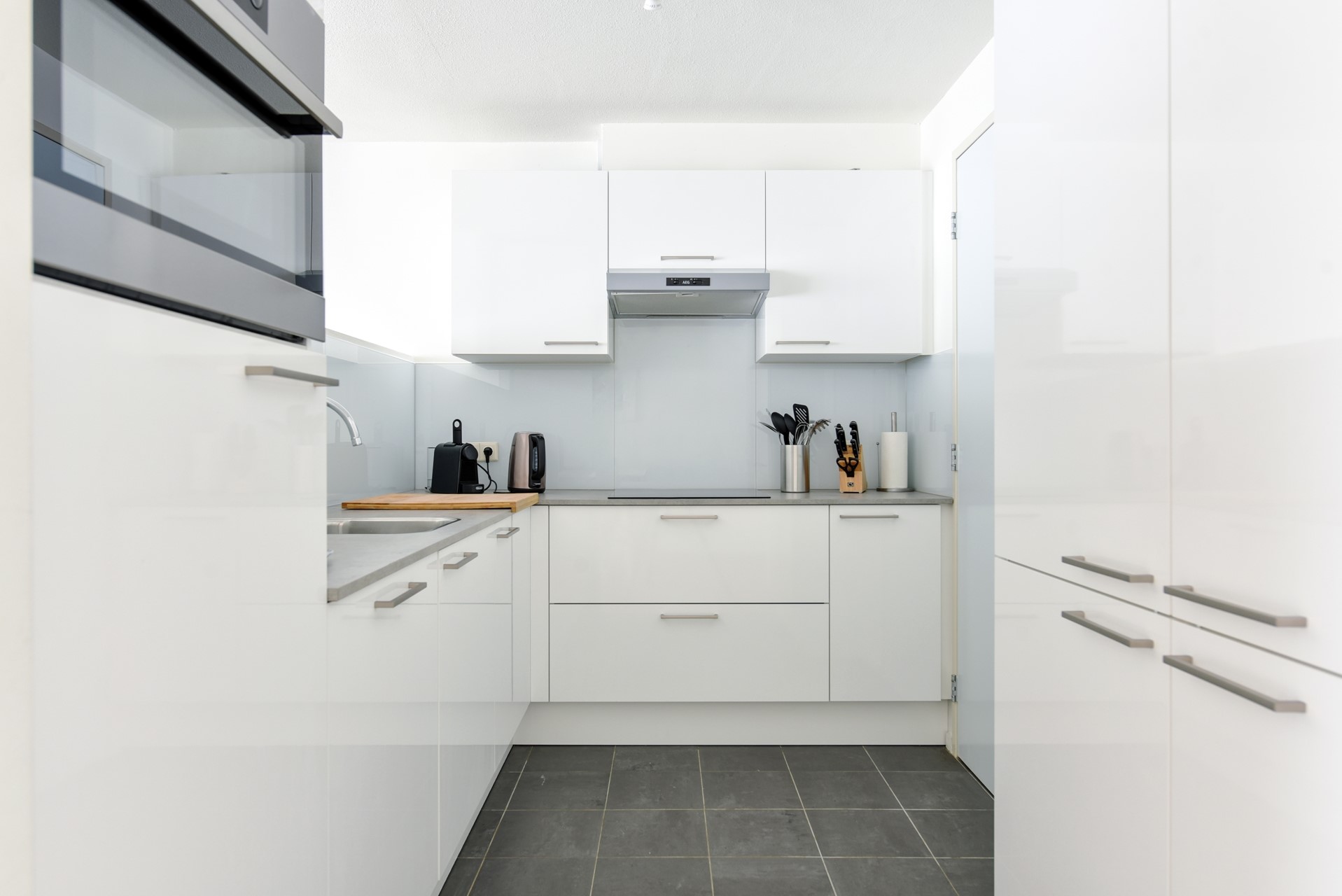 A very spacious and bright living room with French balcony with laminate flooring overlooking the Jan van Lieshoutstraat/Heuvel Gallery. The luxurious modern open kitchen with tiled floor is equipped with all appliances including induction hob, extractor, microwave, dishwasher and fridge freezer.