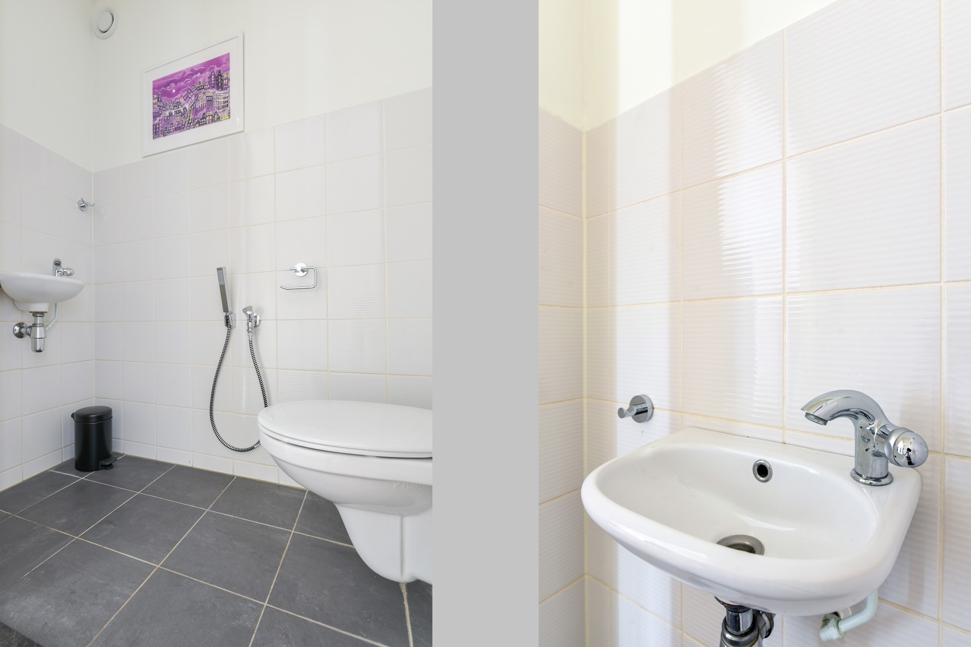 From the hall you have access to the half tiled toilet room with hanging closet, toilet shower and sink.