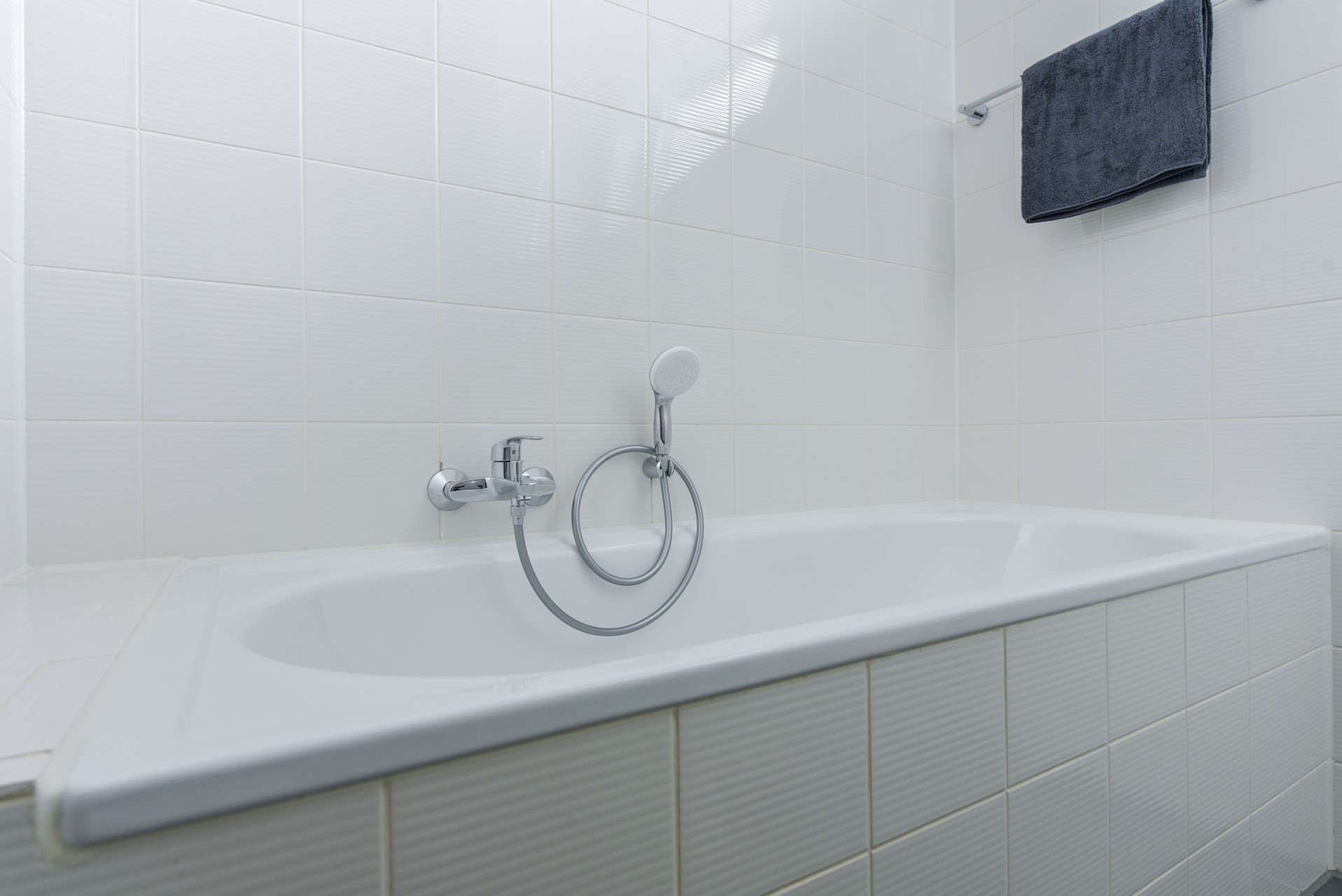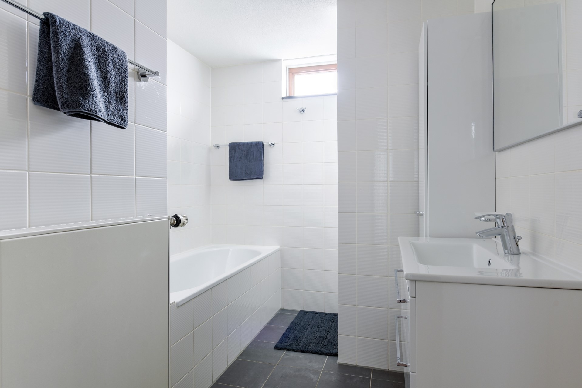 The bathroom is spacious, fully tiled and equipped with a sink with three drawers, radiator, shower and bathtub,