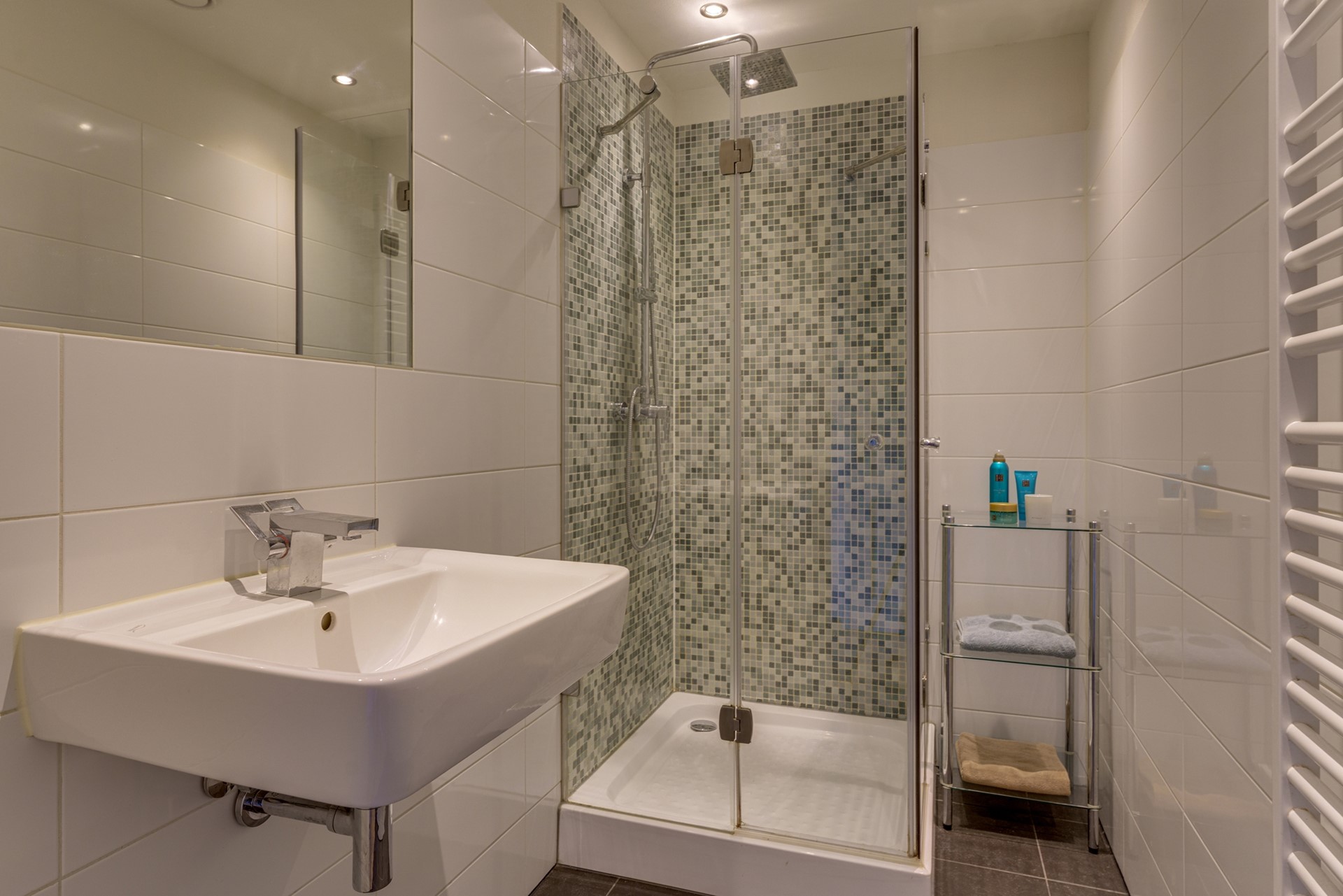 The bedroom has laminate flooring with sleek wall and ceiling finishes. A spacious room with high windows provides plenty of light in this space. The fully tiled bathroom is equipped with a shower with thermostat, sink, and designer radiator.