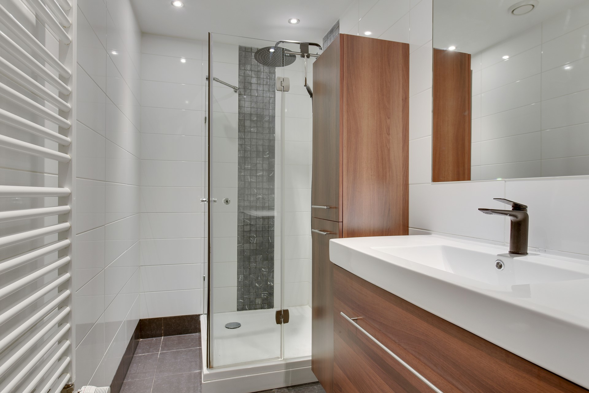 De geheel betegelde moderne badkamer is uitgerust met een regendouche en handdouche met thermostaatkraan, vaste wastafel met lades,