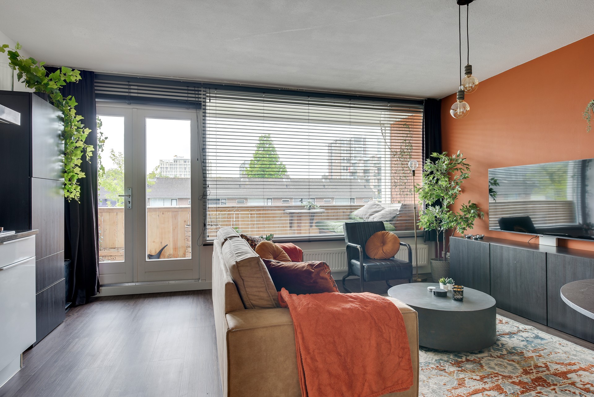 De woonkamer en eethoek is volledig ingericht en voorzien van smart-tv, internet en strakke wand- en plafondafwerking. Tevens geniet de woonkamer van veel lichtinval middels de grote raampartijen en vrij uitzicht. Vanuit de woonkamer hebt u toegang tot het zonnig balkon.