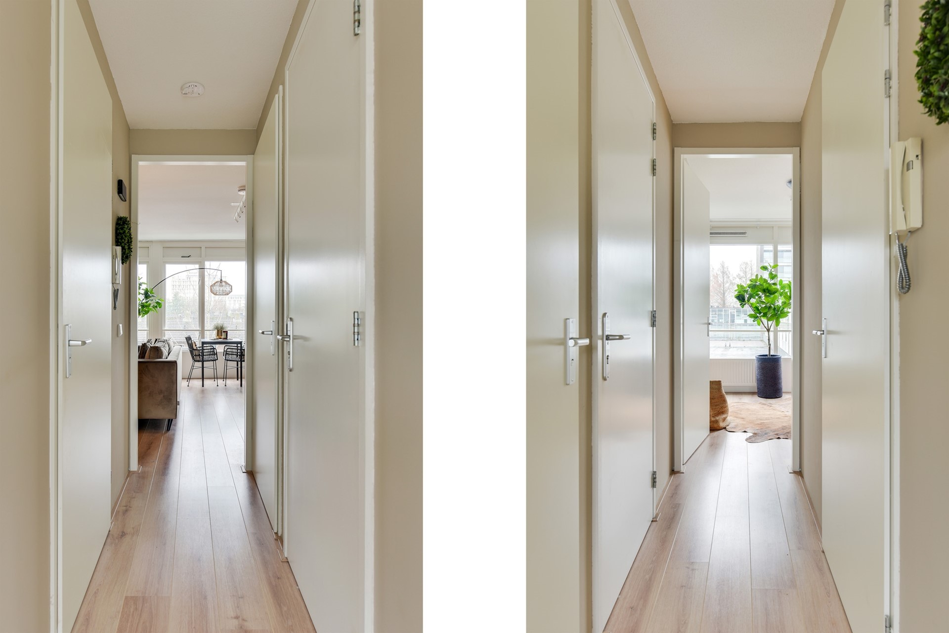 Via de galerij loopt u naar de gezamenlijke entree voor een tweetal appartementen. Eén op de eerste verdieping en één op de tweede verdieping. De gezamenlijke hal is voorzien van eigen meterkast, cv opstelling en internetmodem. Tevens kunt u vanuit de galerij naar de gezamenlijke berging en de afgesloten parkeergarage in de kelder.