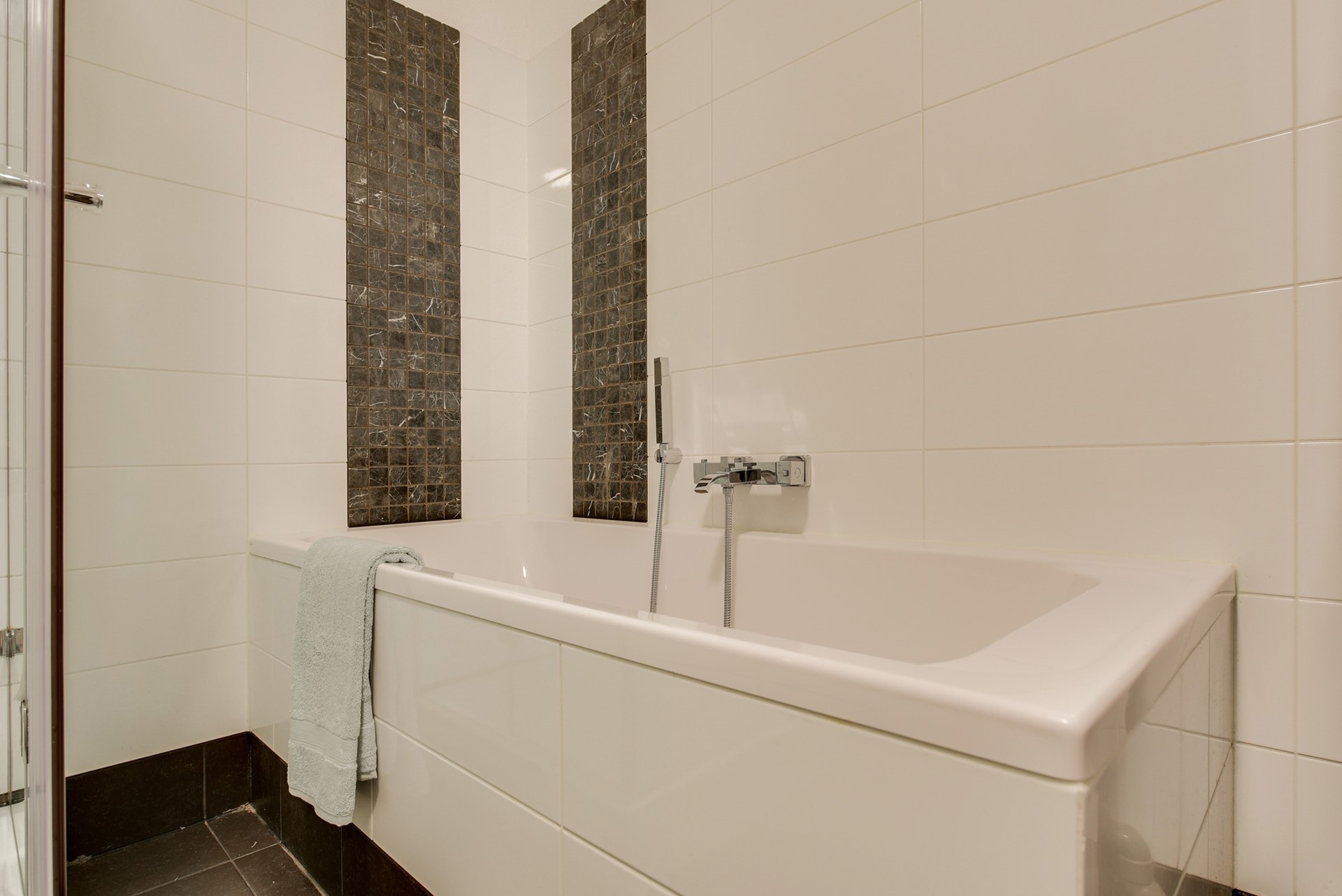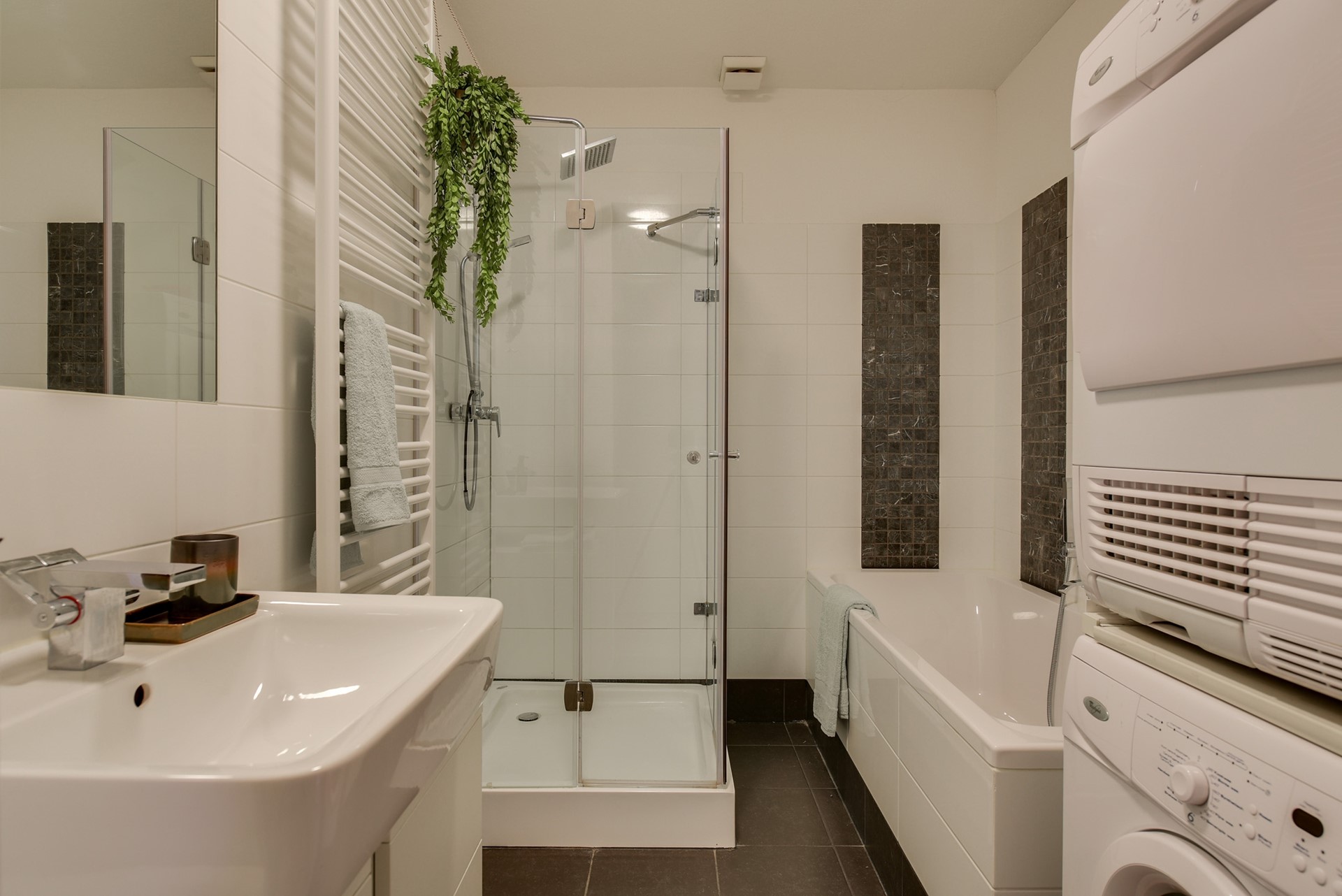 De geheel betegelde moderne badkamer is uitgerust met een regendouche en handdouche met thermostaatkraan, vaste wastafel met wastafelmeubel, ligbad, designradiator, wasmachine en droger.