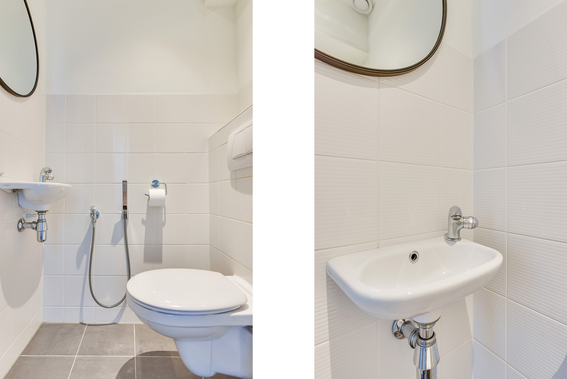 Een aparte hangend toilet voorzien van een tegelvoer, een fonteintje en bidetset.