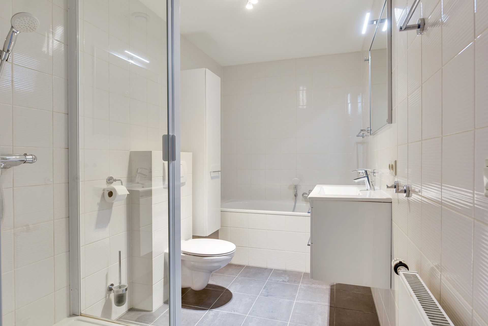 Een volledig betegelde badkamer welke voorzien is van een fijn spuitwerk plafond, wastafel in meubel met lades, designradiator met thermostaatkraan, douchecabine met een mengkraan, een ligbad met mengkraan, mechanische installatie.