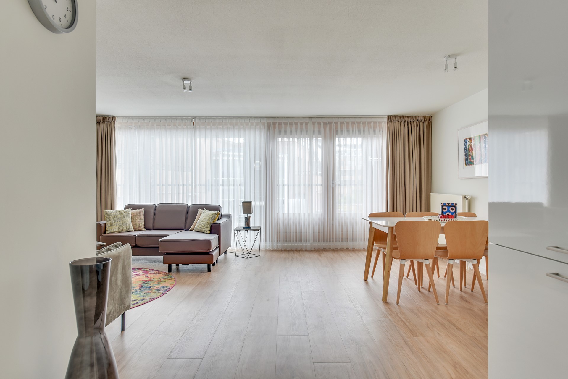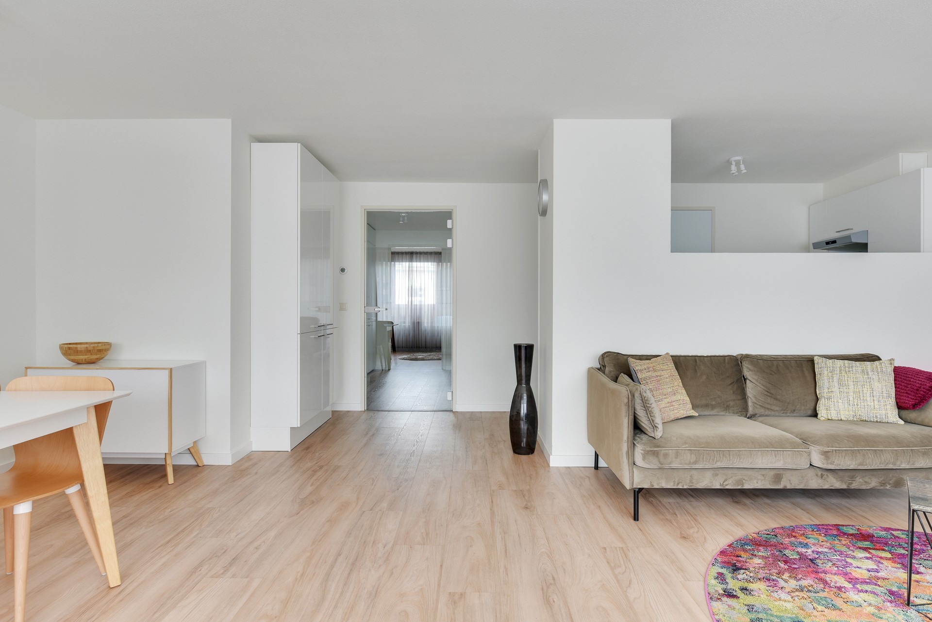 De ruime woonkamer is voorzien laminaatvloer met openslaande deuren naar het ruime dakterras aan de voorzijde gelegen met schitterend uitzicht op de Jan van Lieshoutstraat/Heuvel Galerie dakterras.