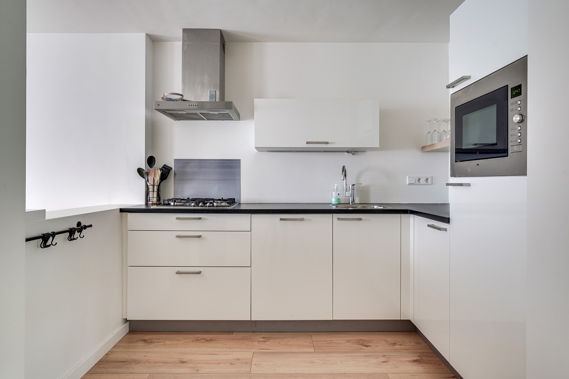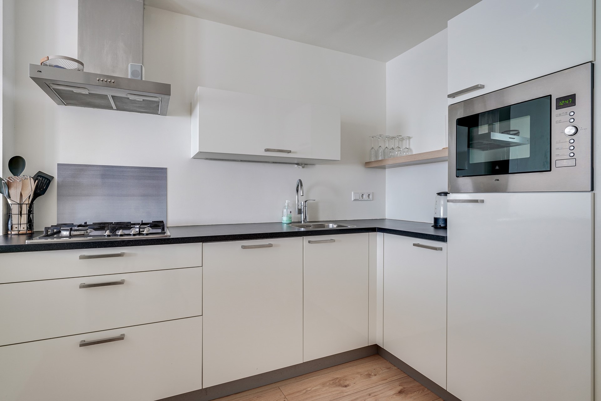 De moderne en lichte keukenopstelling is voorzien is 4-pits gaskookplaat, RVS afzuigkap en RVS spoelbak. Daarnaast heeft de keuken een ingebouwde vaatwasser, koelkast met vriesvak, combimagnetron en diverse opbergkasten met meer dan genoeg ruimte.