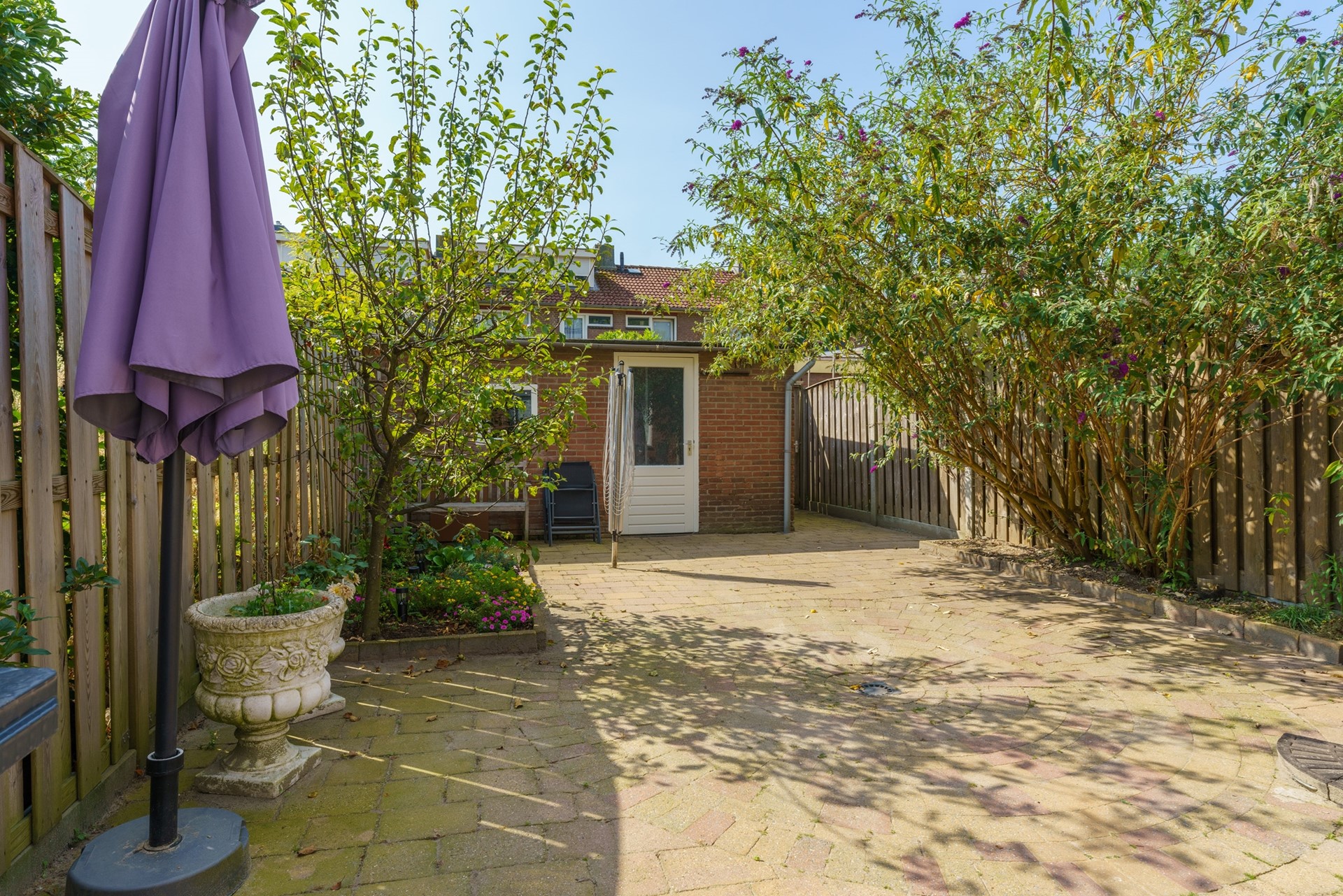 De achtertuin is grotendeels bestraat en is hierdoor onderhoudsvriendelijk. De tuin ligt op het zuiden zodat er optimaal van de zon genoten kan worden. Daarnaast is tuin voorzien van een kraantje en een achterom.
