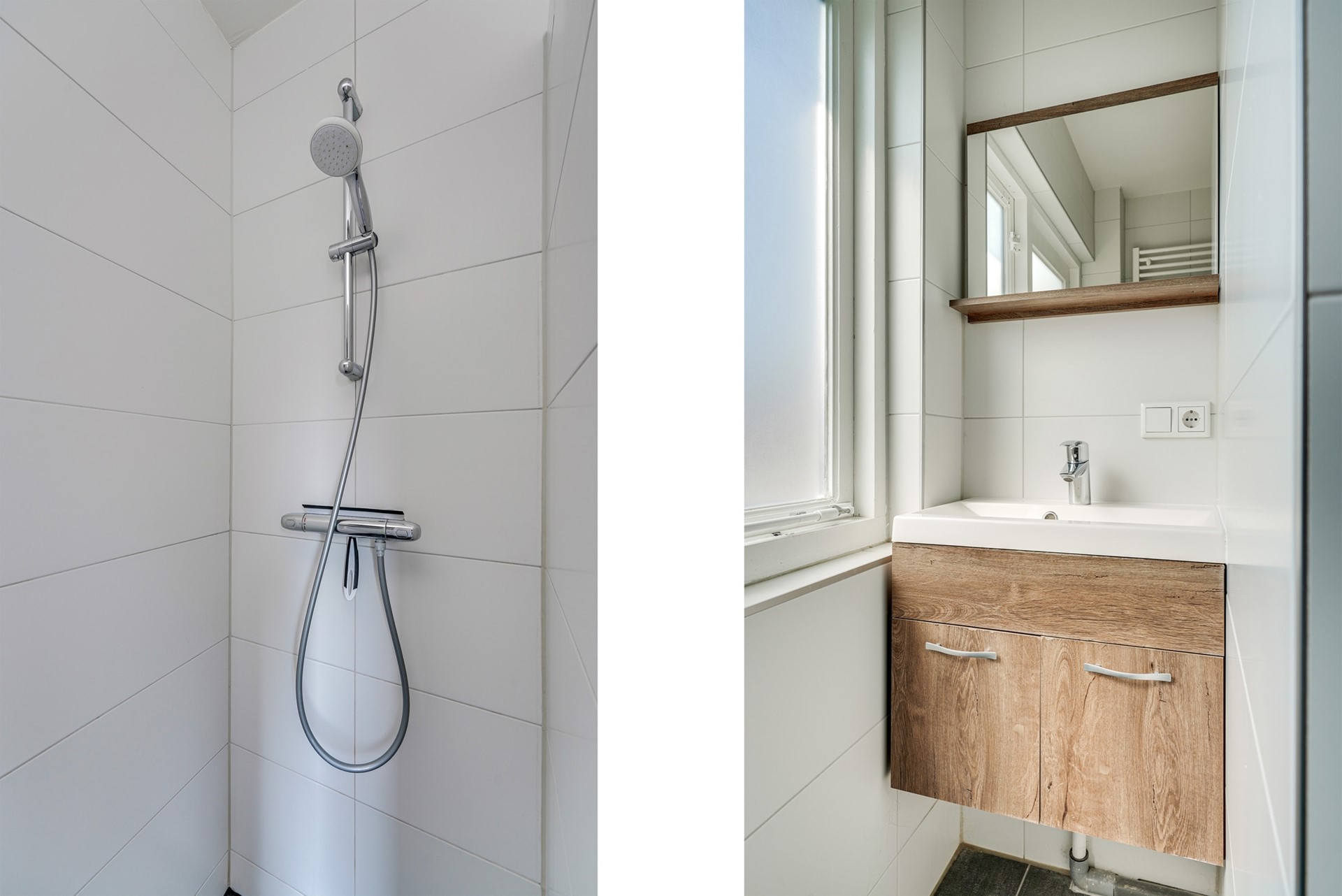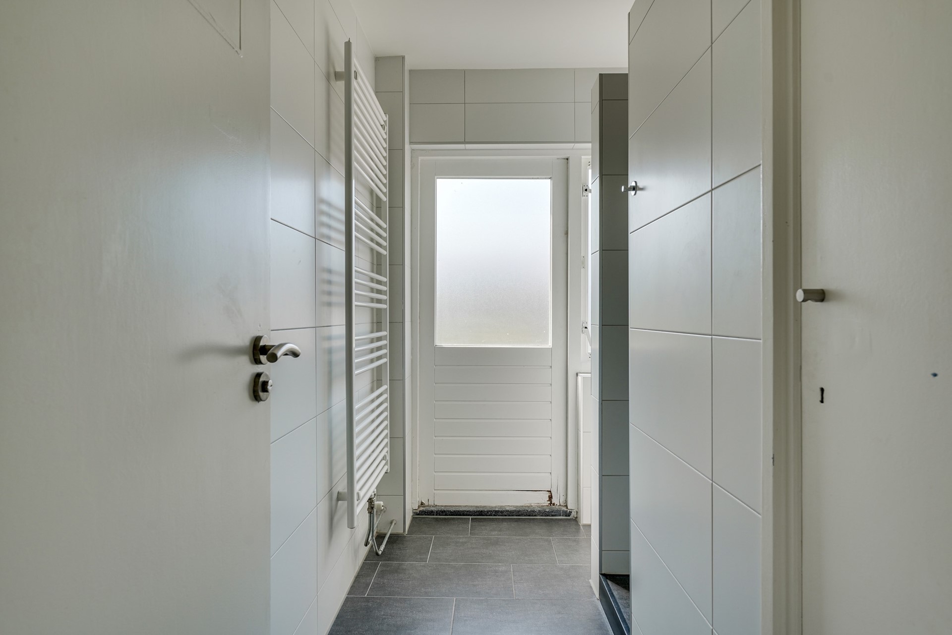 De geheel betegelde moderne badkamer is uitgerust met een inloopdouche, design radiator, en een vaste wastafel met meubel, opbergruimte en ligt aan de achterzijde van de woning. Tevens is de badkamer voorzien van een raam en een deur wat zorgt voor voldoende daglicht en natuurlijke ventilatie.