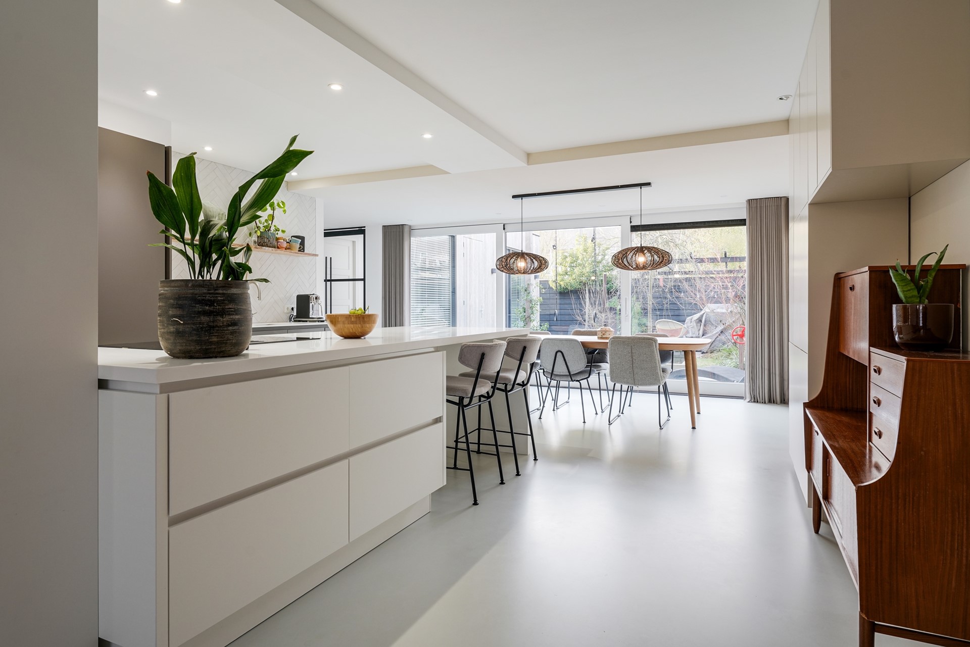 De luxe keuken vormt het hart van de woning en is uitgevoerd in een moderne, strakke stijl. Het royale kookeiland in combinatie met hoogwaardige inbouwapparatuur zorgt voor optimaal comfort en gebruiksgemak. Het naadloos afgewerkte werkblad en de slimme indeling bieden volop werk- en opbergruimte, waardoor de keuken zowel praktisch als overzichtelijk is. Dankzij de directe verbinding met de eethoek is dit een fijne plek voor dagelijks gebruik, maar ook uitermate geschikt voor uitgebreid koken en het ontvangen van gasten in een ontspannen en stijlvolle setting.