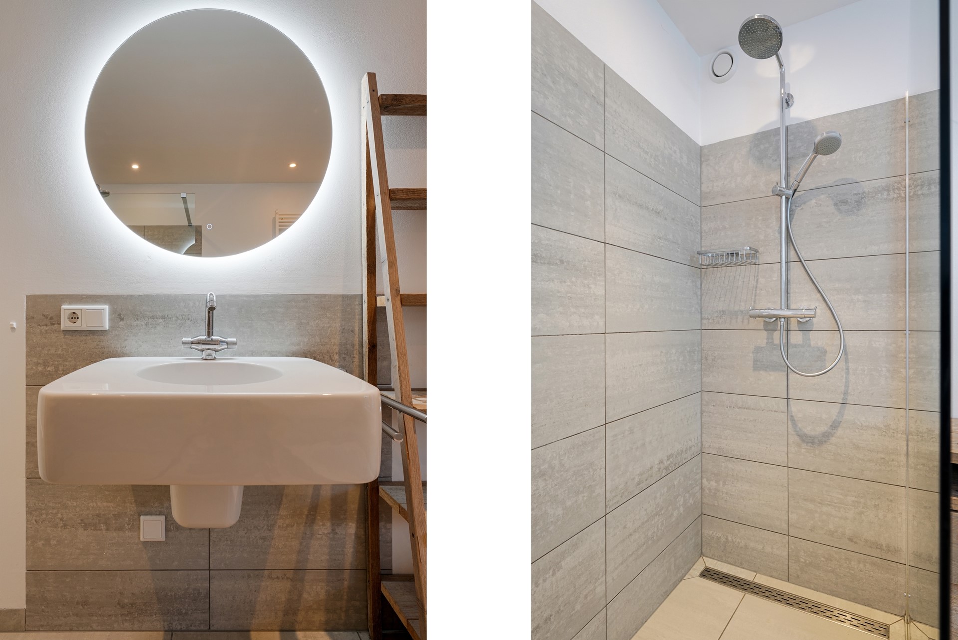 De sanitaire ruimtes zijn modern en luxe uitgevoerd. Er is gebruikgemaakt van hoogwaardige materialen en rustige kleurnuances, wat zorgt voor een verzorgde en comfortabele uitstraling. De badkamer is voorzien van een royale inloopdouche met regendouche, moderne wastafels, spiegels met sfeerverlichting en strak afgewerkte kranen. Een plek waar u de dag ontspannen begint en afsluit.