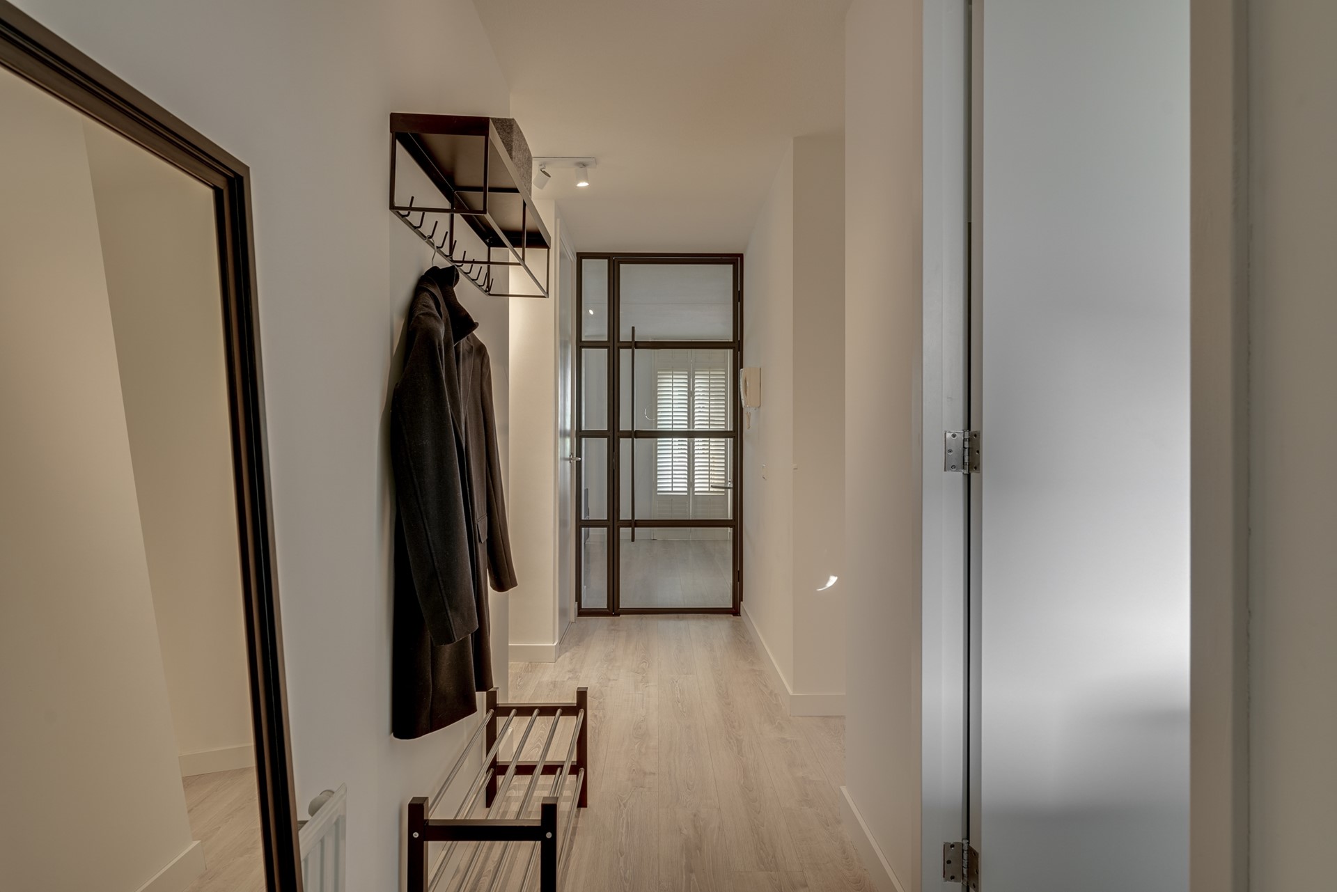 De ruime woonkamer (ca. 34 m²) heeft grote ramen die zorgen voor veel lichtinval en zijn voorzien van stijlvolle shutters. Vanuit de woonkamer is het balkon van ca. 8 m² bereikbaar, gelegen op het noorden, met rookglas panelen en uitzicht op het stationsplein.
