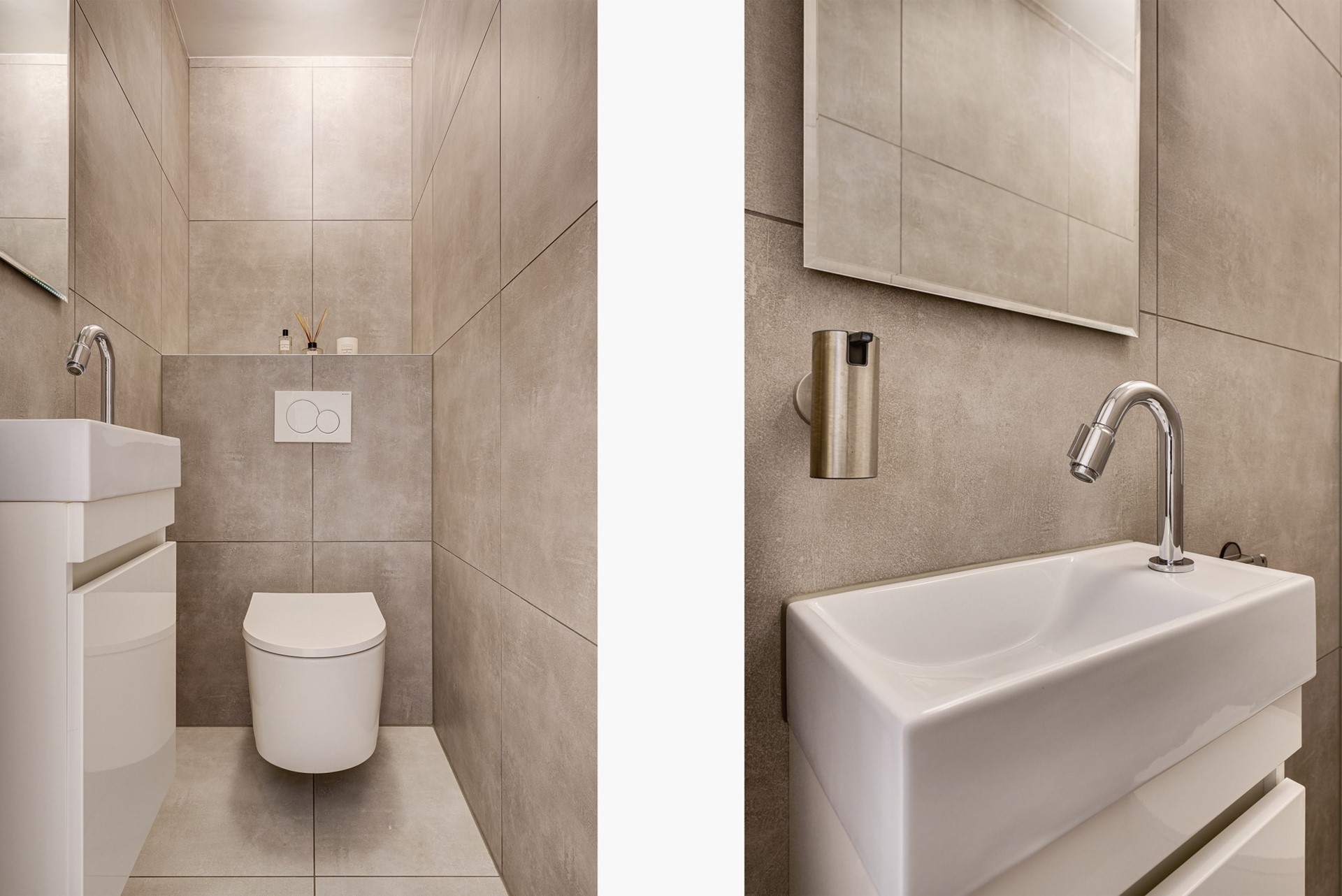 Toilet: Modern betegelde hangend toilet met fonteintje in meubel.