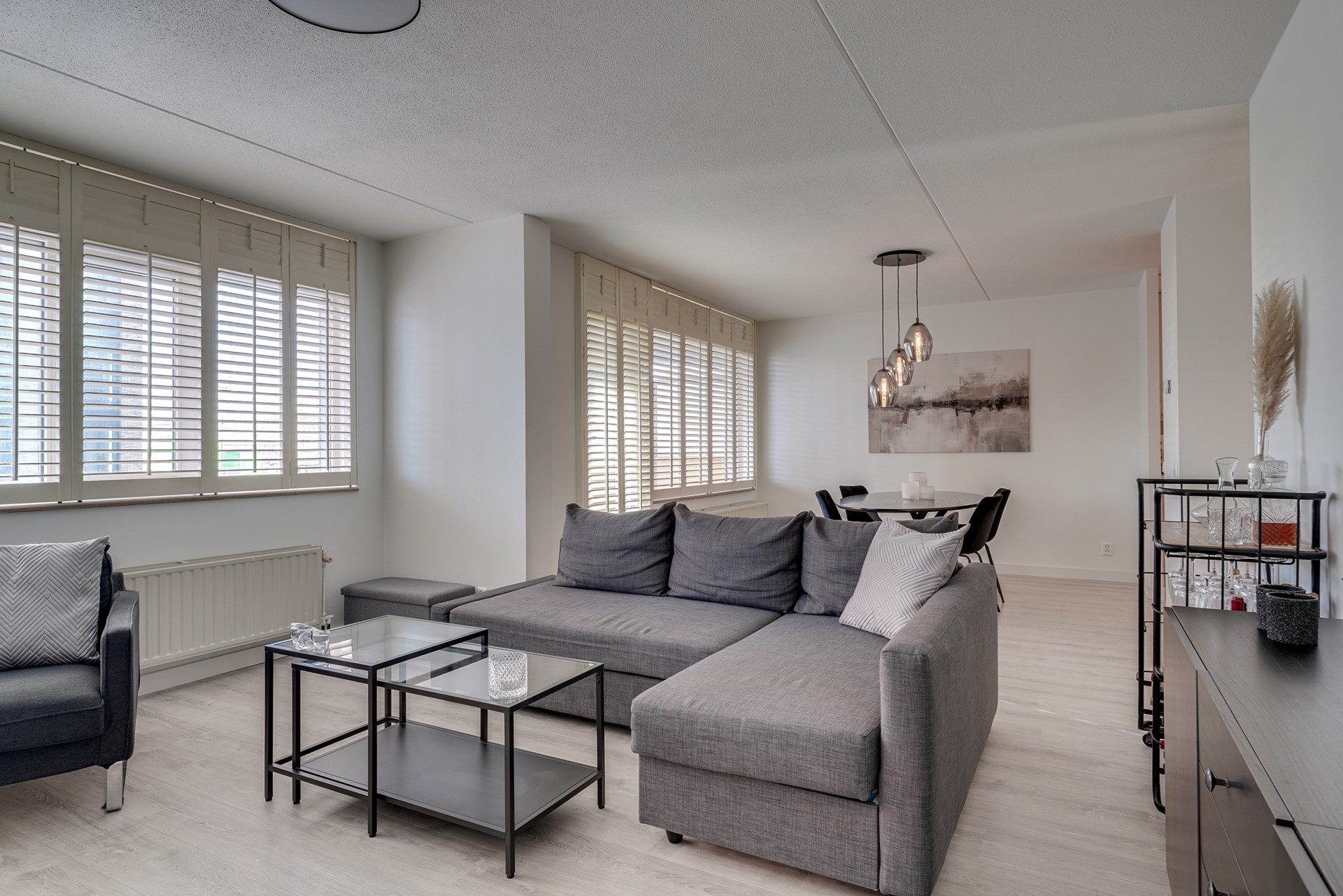 - Verrassend ruime en lichte woonkamer met sfeervolle shutters