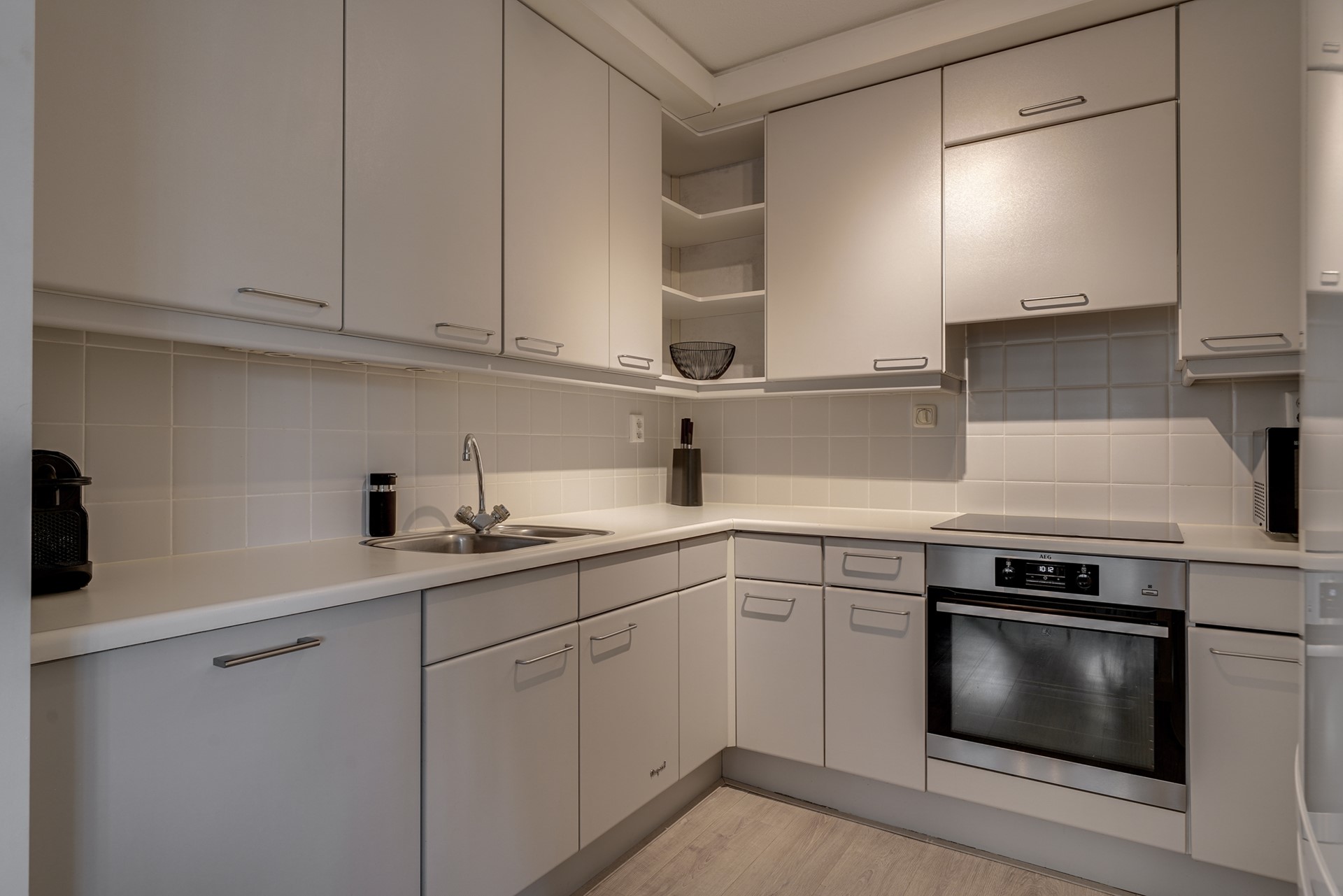 Keuken: De open keuken heeft een L-vormige opstelling en is uitgerust met inbouwapparatuur zoals een inductiekookplaat, vaatwasser, en oven. Voor extra flexibiliteit staat er een losse koelkast met vriezer en magnetron.
