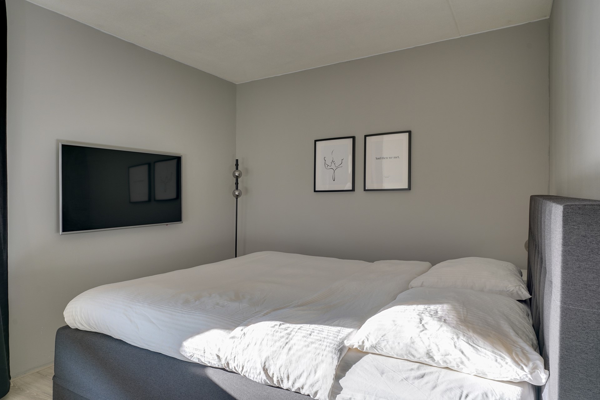 Slaapkamer 2: De ruime masterbedroom is ingericht met een tweepersoons boxspring, ruime kledingkast en een flatscreen