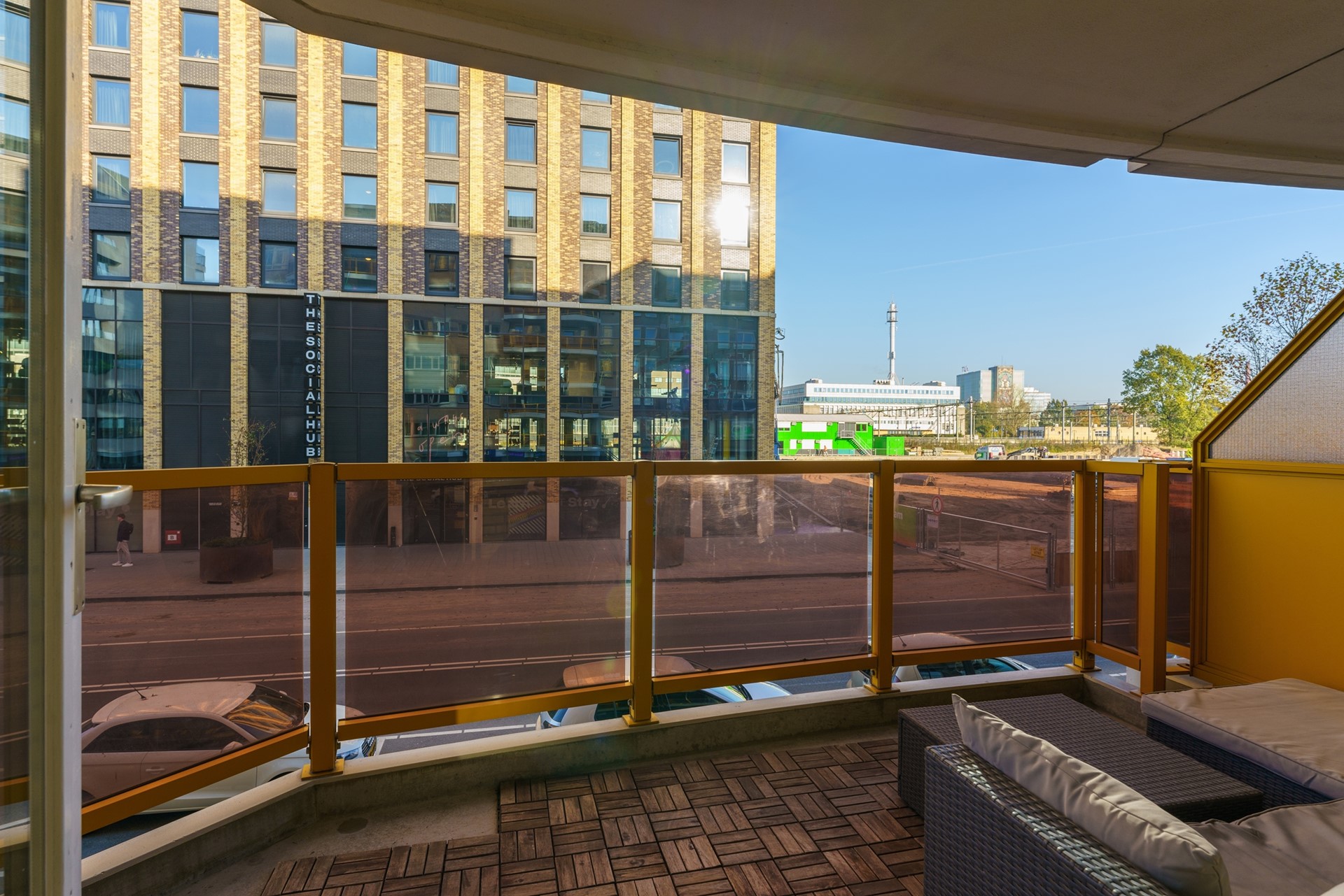 Het royale balkon biedt meer dan genoeg ruimte voor een fijne loungeset, waardoor je hier heerlijk kunt ontspannen. Vanaf deze buitenruimte heb je een vrij uitzicht richting Station Eindhoven en geniet je van de levendige sfeer van het bruisende stadscentrum. Een ideale plek om midden in het hart van de stad toch in alle rust buiten te zitten.