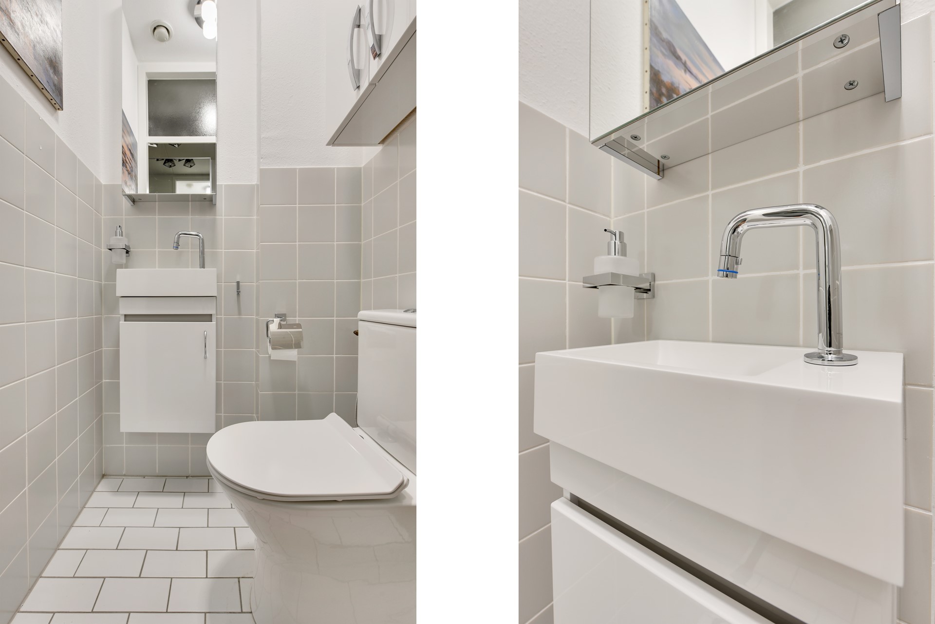 Moderne, betegelde toiletruimte met staand closet en fonteintje met meubel.