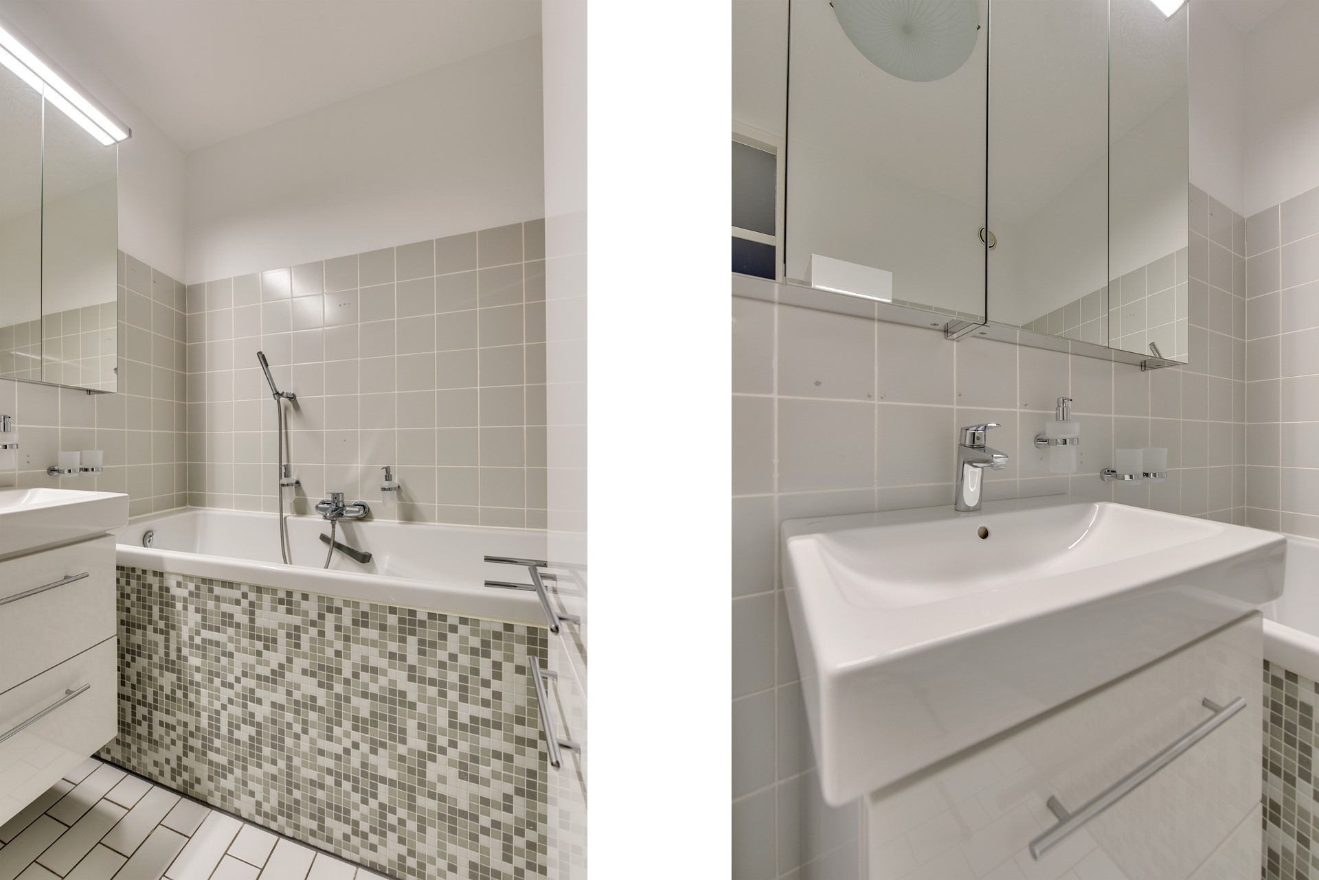 Volledig betegelde badkamer voorzien van ligbad met douche voorziening, wastafel in wasmeubel met mengkraan en wasmachine-droger.
