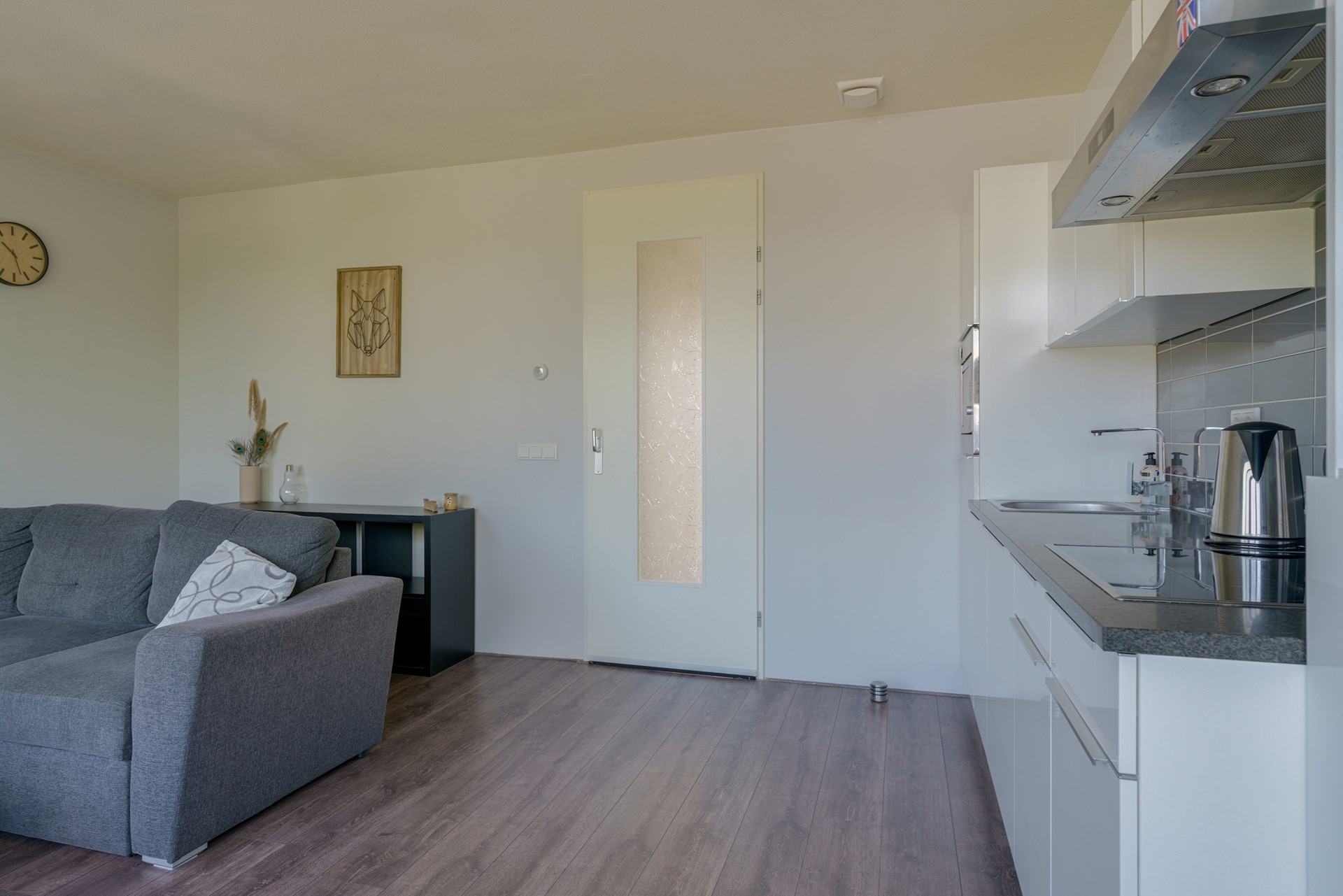 De open keuken is voorzien van een afzuigkap, inductiekookplaat, combimagnetron, koelkast met vriesvak, vaatwasser en voldoende opbergruimte.