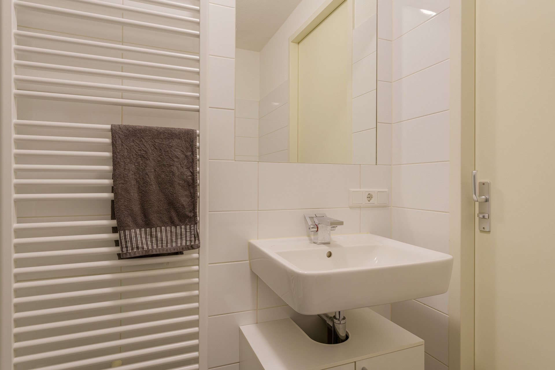 De badkamer is ruim en praktisch ingericht met een aparte douche met thermostaatkraan, een vaste wastafel en een designradiator
