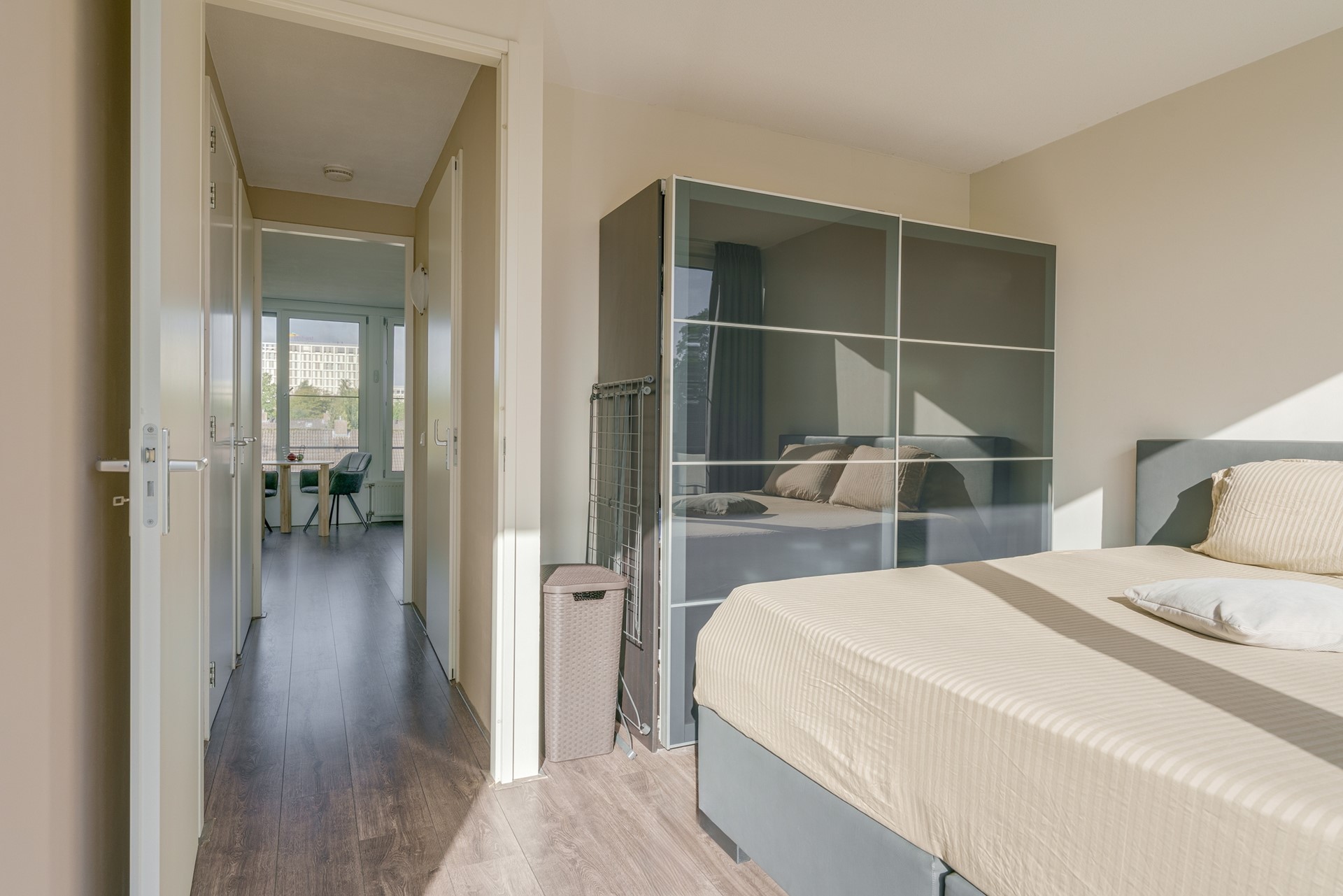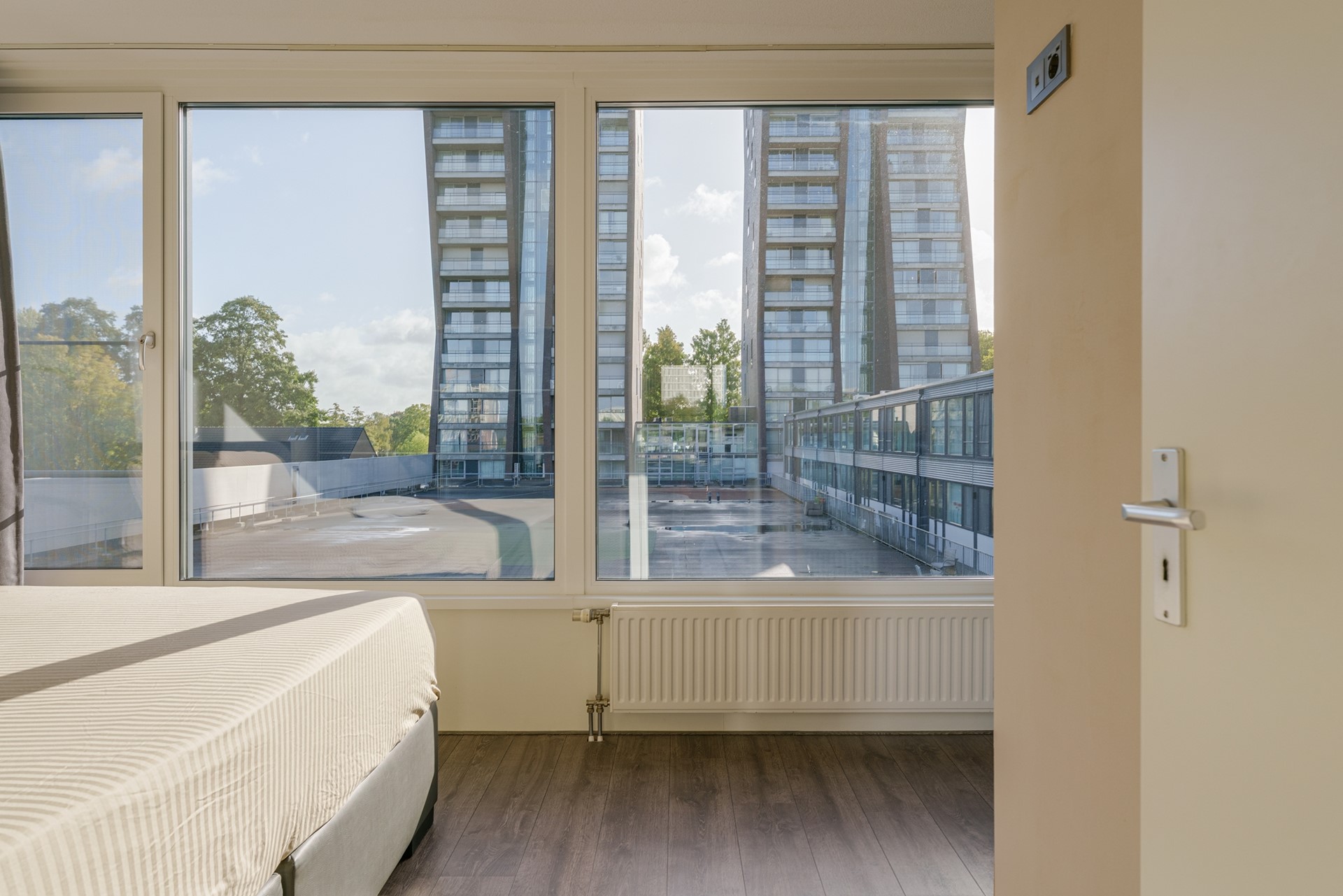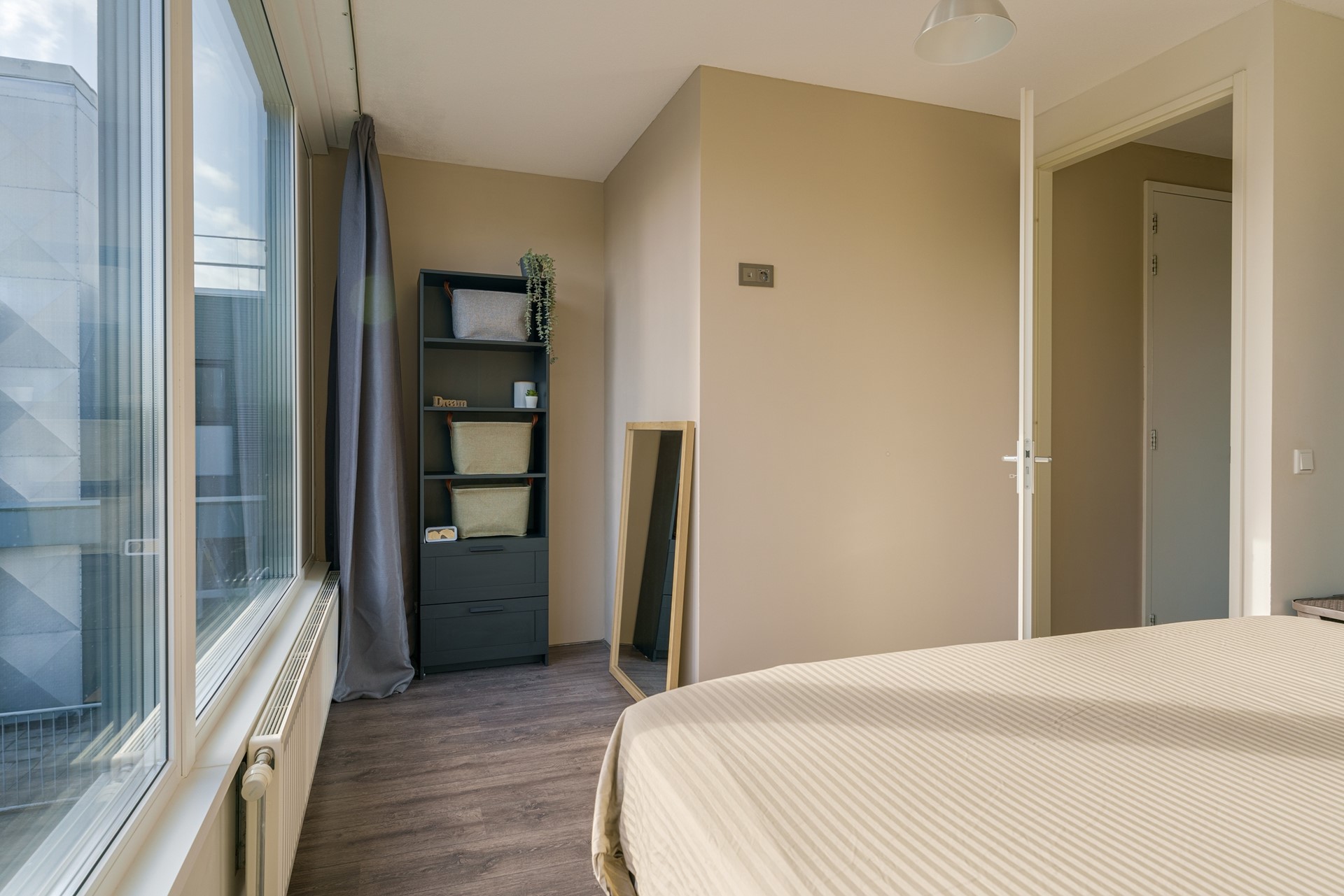 De slaapkamer is voorzien van een laminaatvloer met strakke wand- en plafondafwerking. Een ruime kamer met hoge raampartij zorgt voor veel lichtinval in deze ruimte.