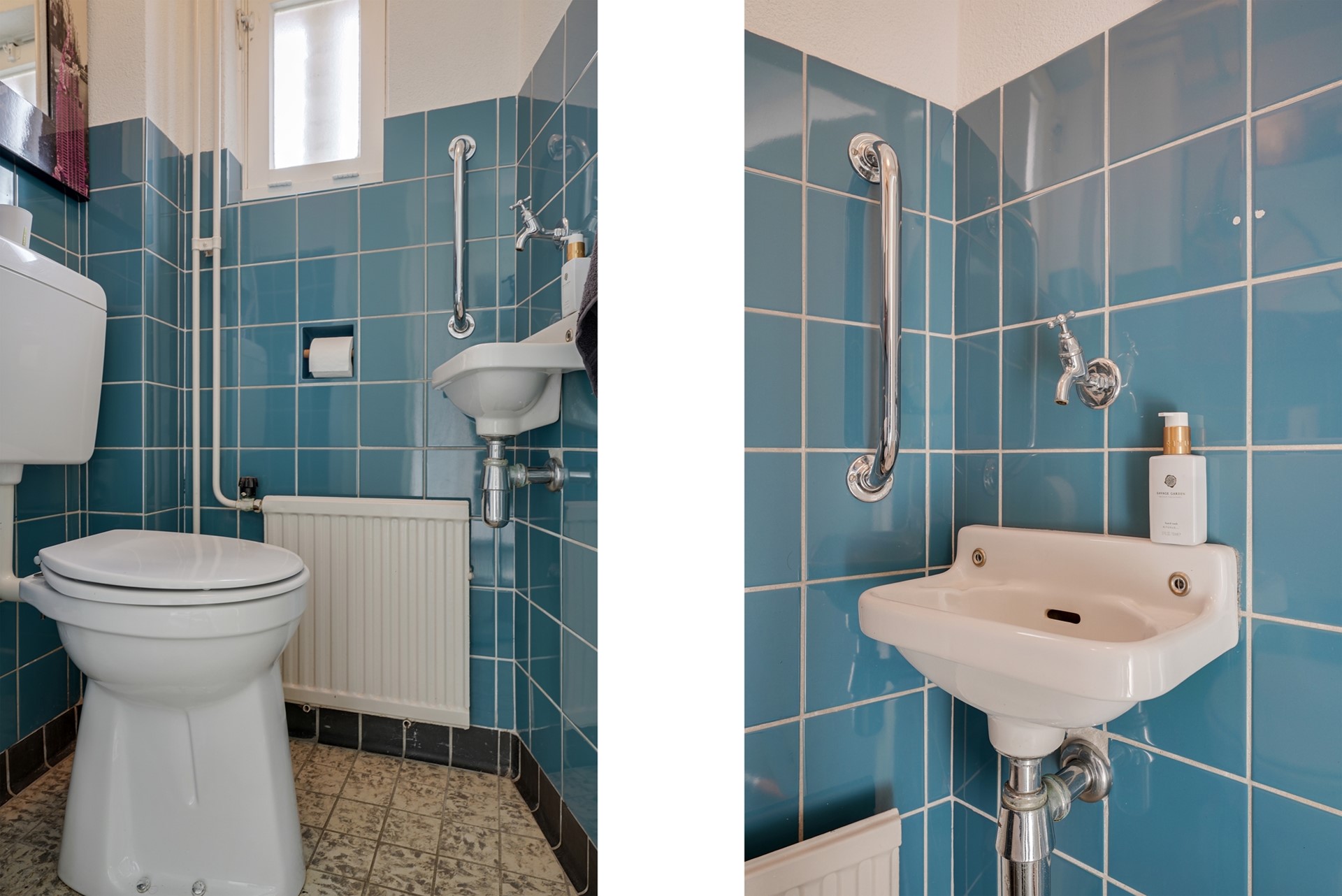 Het gedeeltelijk betegelde toilet is praktisch ingericht en voorzien van een staand closet, fonteintje en een raam, wat zorgt voor natuurlijke ventilatie.