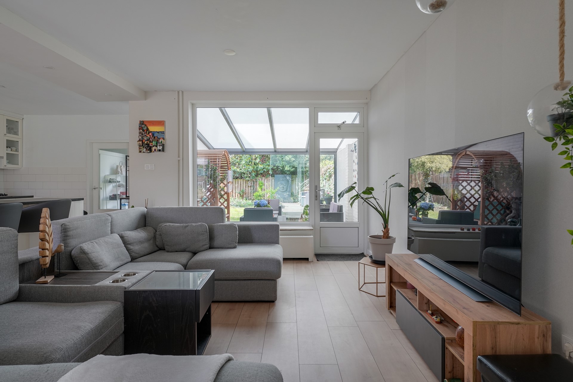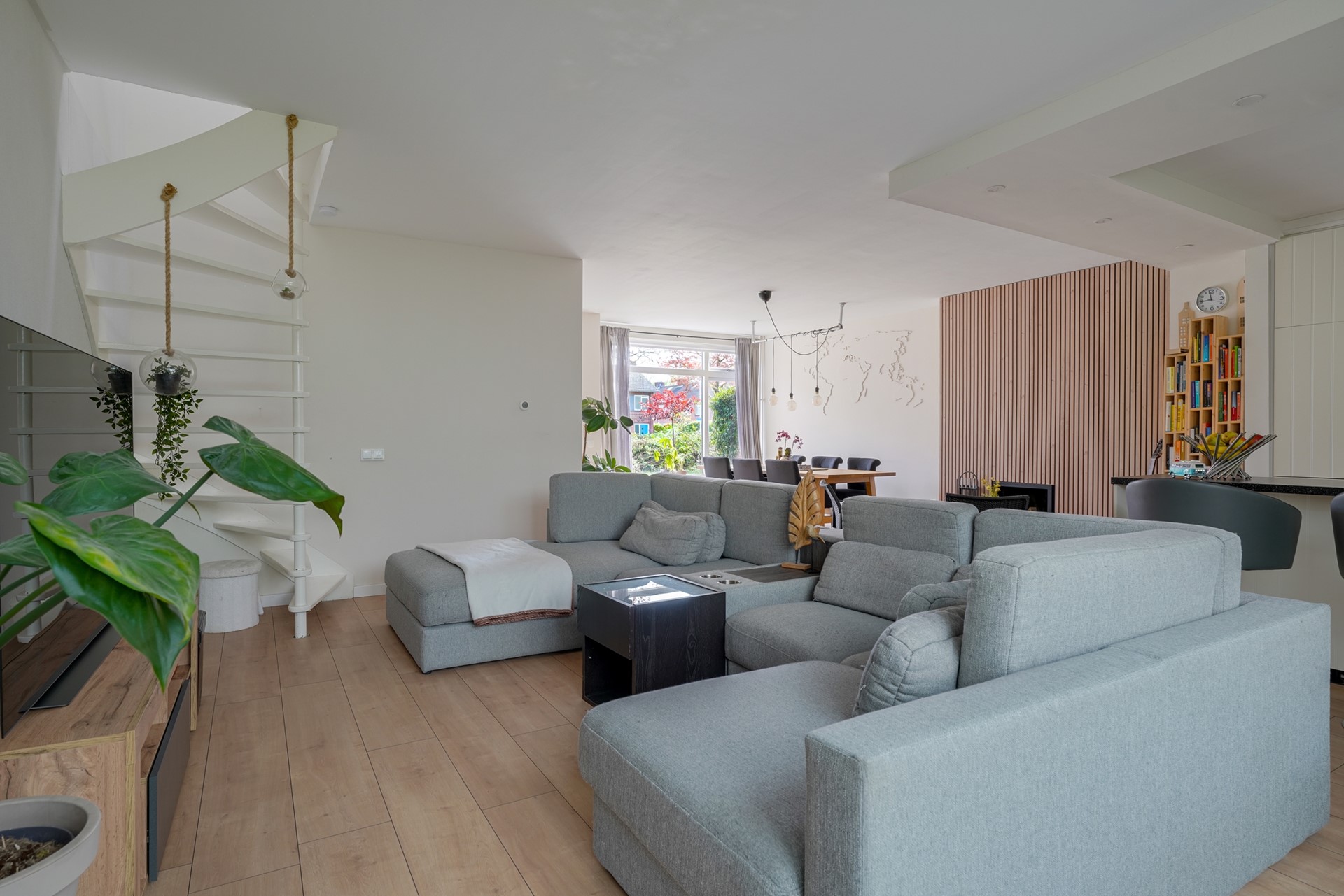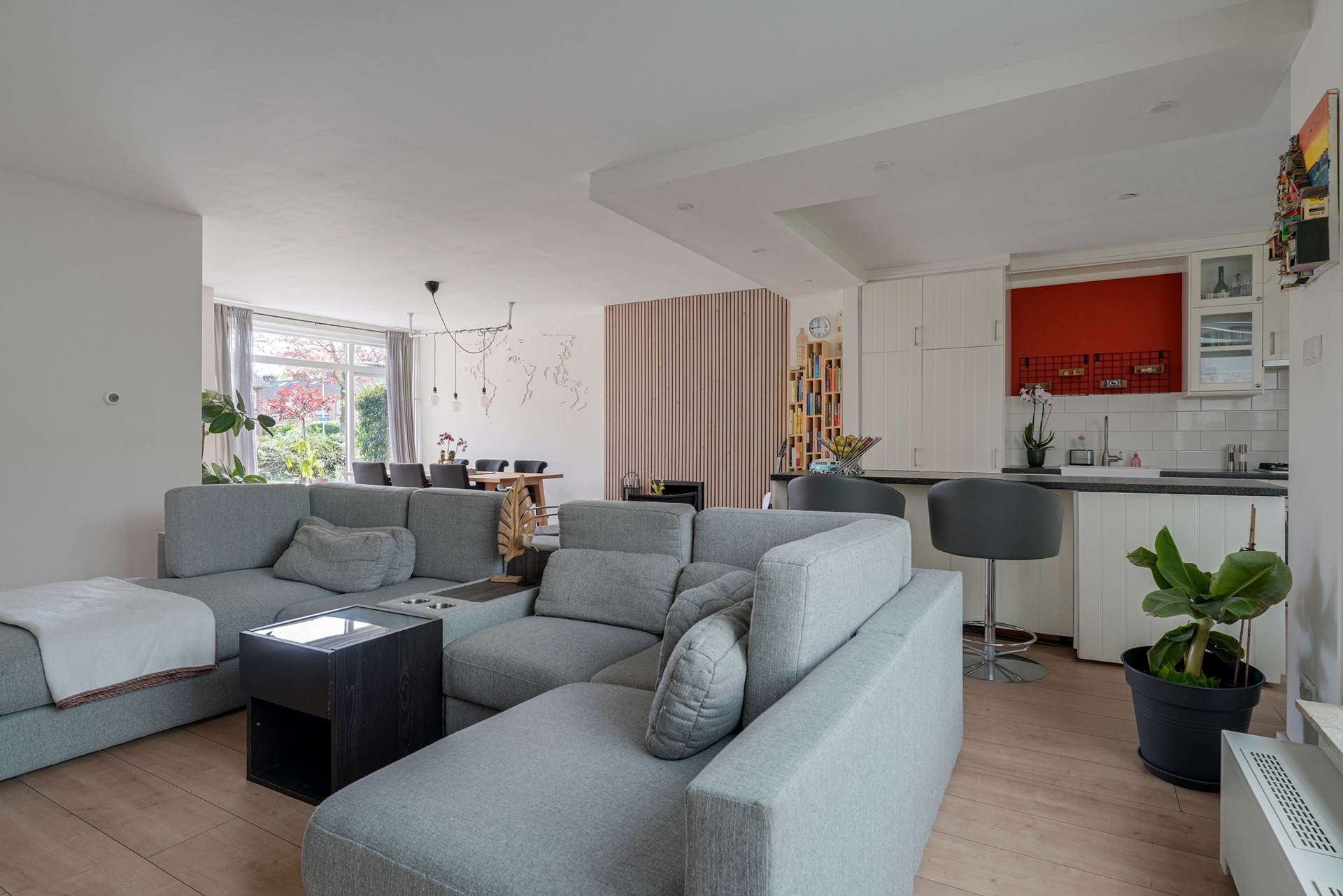 De ruime en lichte L‑vormige woonkamer vormt het hart van de woning. De sfeervolle open haard zorgt voor extra warmte en gezelligheid, terwijl de laminaatvloer en grote raampartijen bijdragen aan een moderne en comfortabele uitstraling. De prettige lichtinval en de aanwezigheid van de hardhouten trapopgang maken dit tot een fijne en uitnodigende leefruimte, perfect voor zowel ontspanning als gezellig samenzijn.