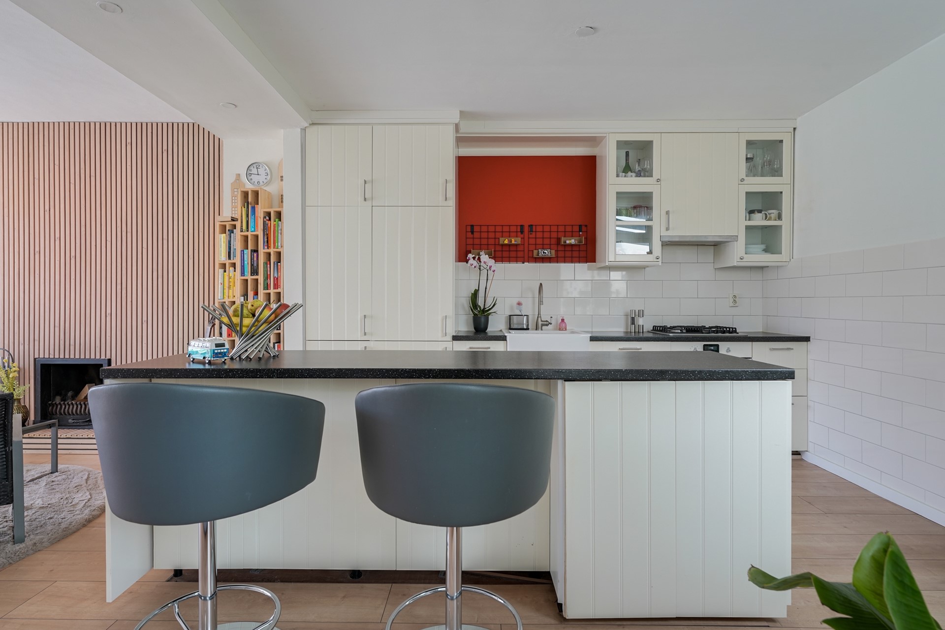 De bar biedt extra werk- en opbergruimte en maakt de keuken tot een sociale plek waar koken en samenzijn moeiteloos samengaan — ideaal voor lange avonden tafelen en gezellige etentjes met familie of vrienden.