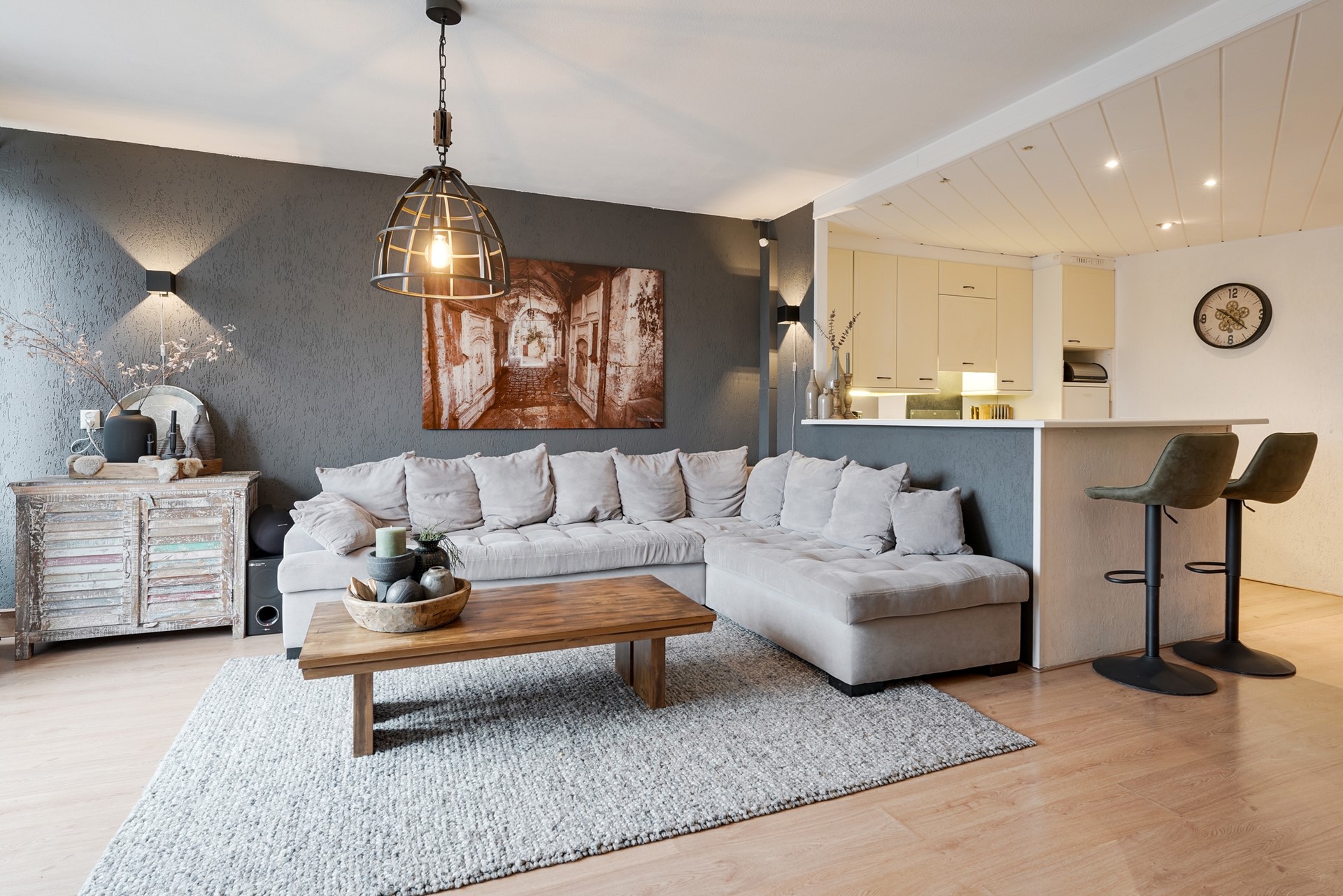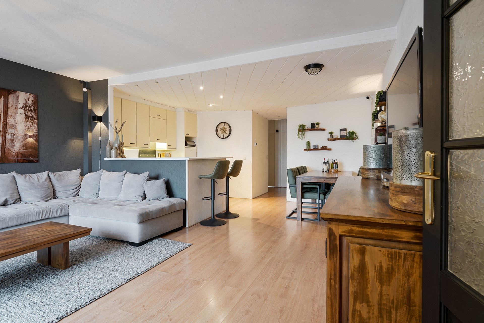 Lichte en sfeervolle woonkamer (ca. 4,71 m breed) met openslaande deuren naar het royale dakterras. De ruimte is voorzien van een nette laminaatvloer en strakke wand- en plafondafwerking. Dankzij de grote raampartijen geniet je van veel daglicht.