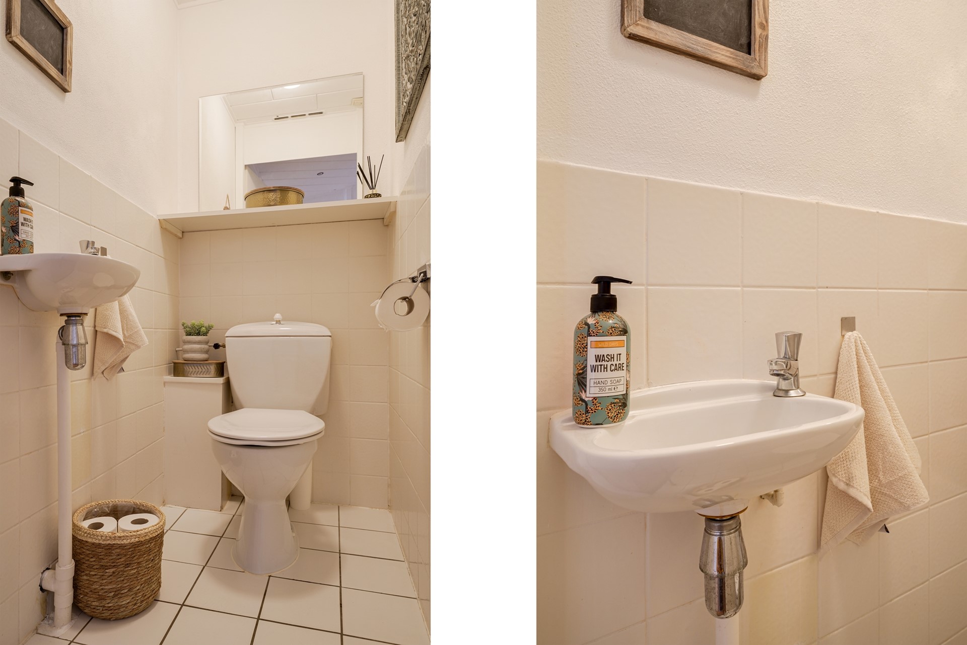 Separate toiletruimte met wandcloset en fonteintje, volledig betegeld.